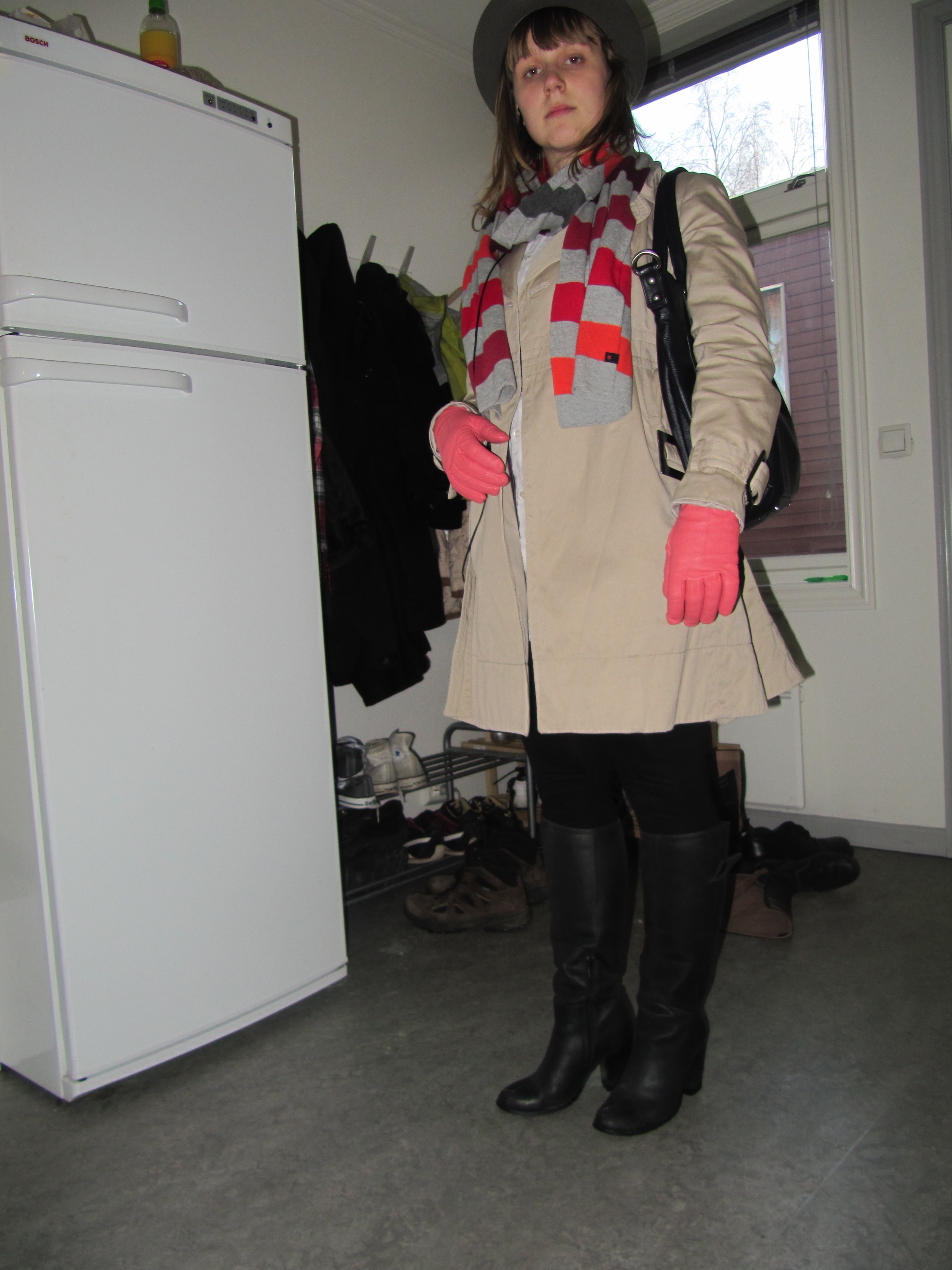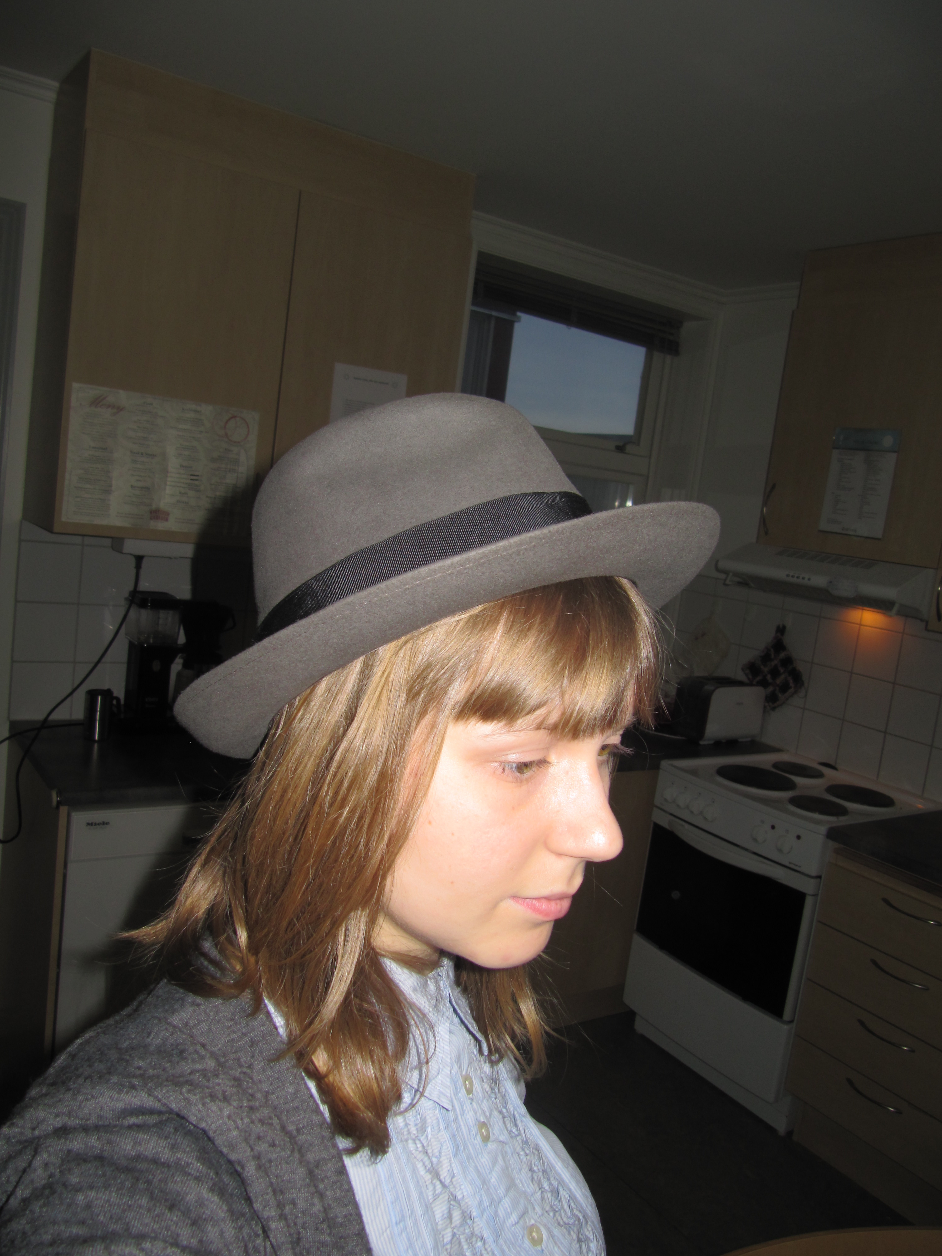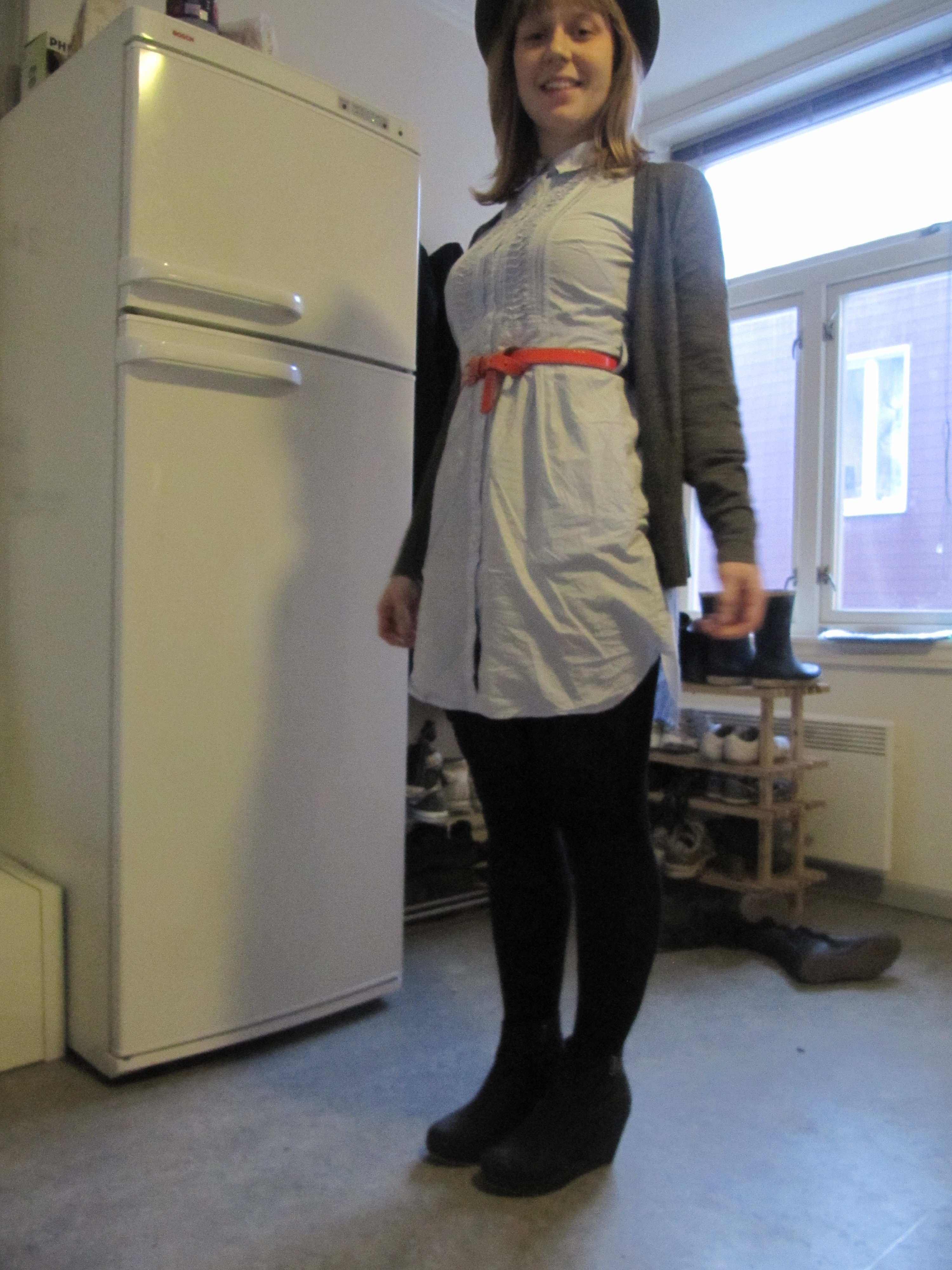 My ever faithful shirtdress, this time with electric orange D&G belt, grey merino cardigan from H&M (men section) and my lovely Borsalino