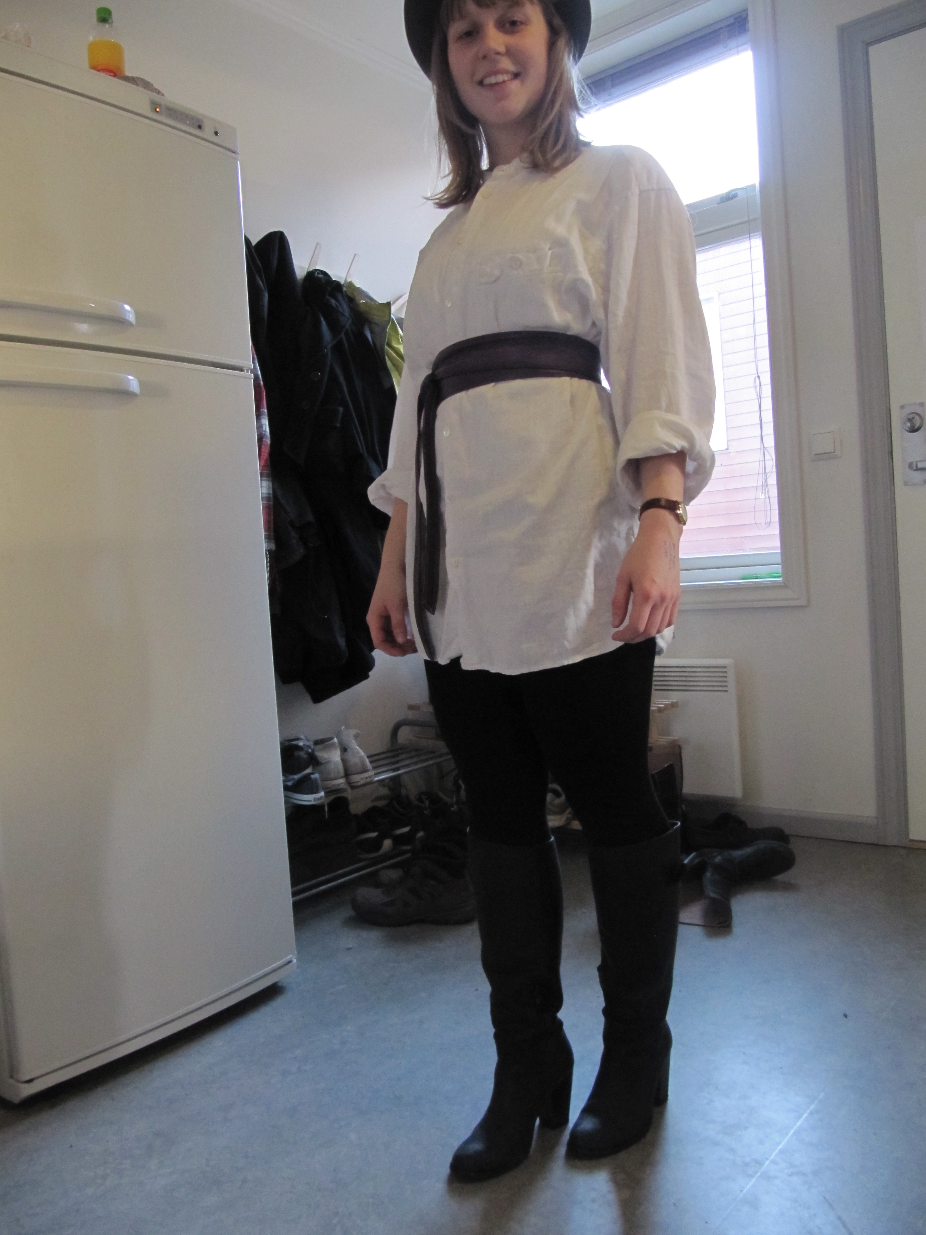 My dad’s old shirt with my purple leather belt, a hat and a nice pair of boots and you’re all set.