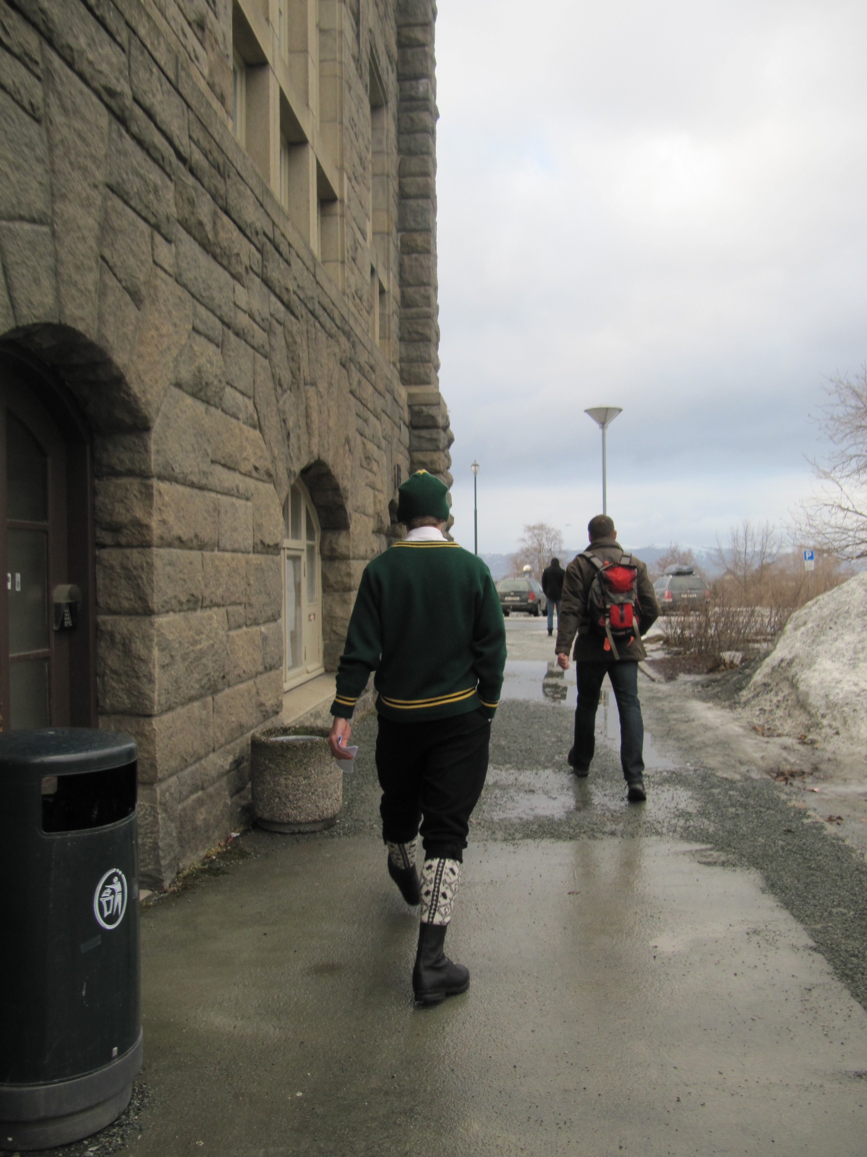 Lurer du på hva dette er? En gallakledd NTNUIer. NTNUI, studentidrettslaget på NTNU, har grønt med gule striper som sine farger. Du ser han er gallakledd på finstrømpene og kvitskjorta 😉 NTNUI dro med tre busser sørover for å overvære siste helga av VM.