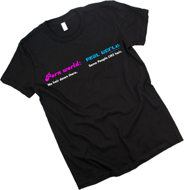 She has a site called makelovenotporn.com with pages like this one with porn world vs. normal world and sell t-shirts with prints like this one on them: