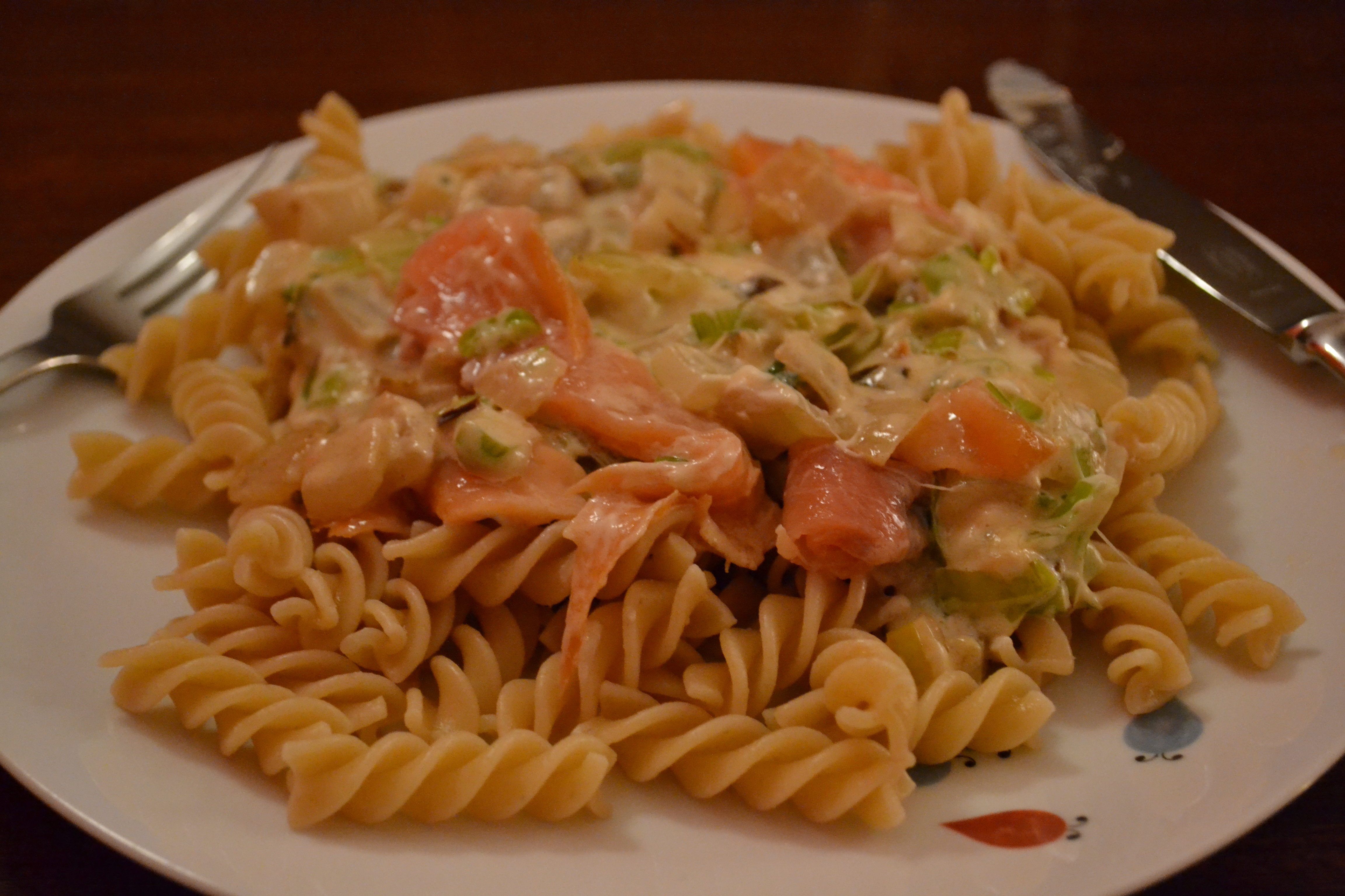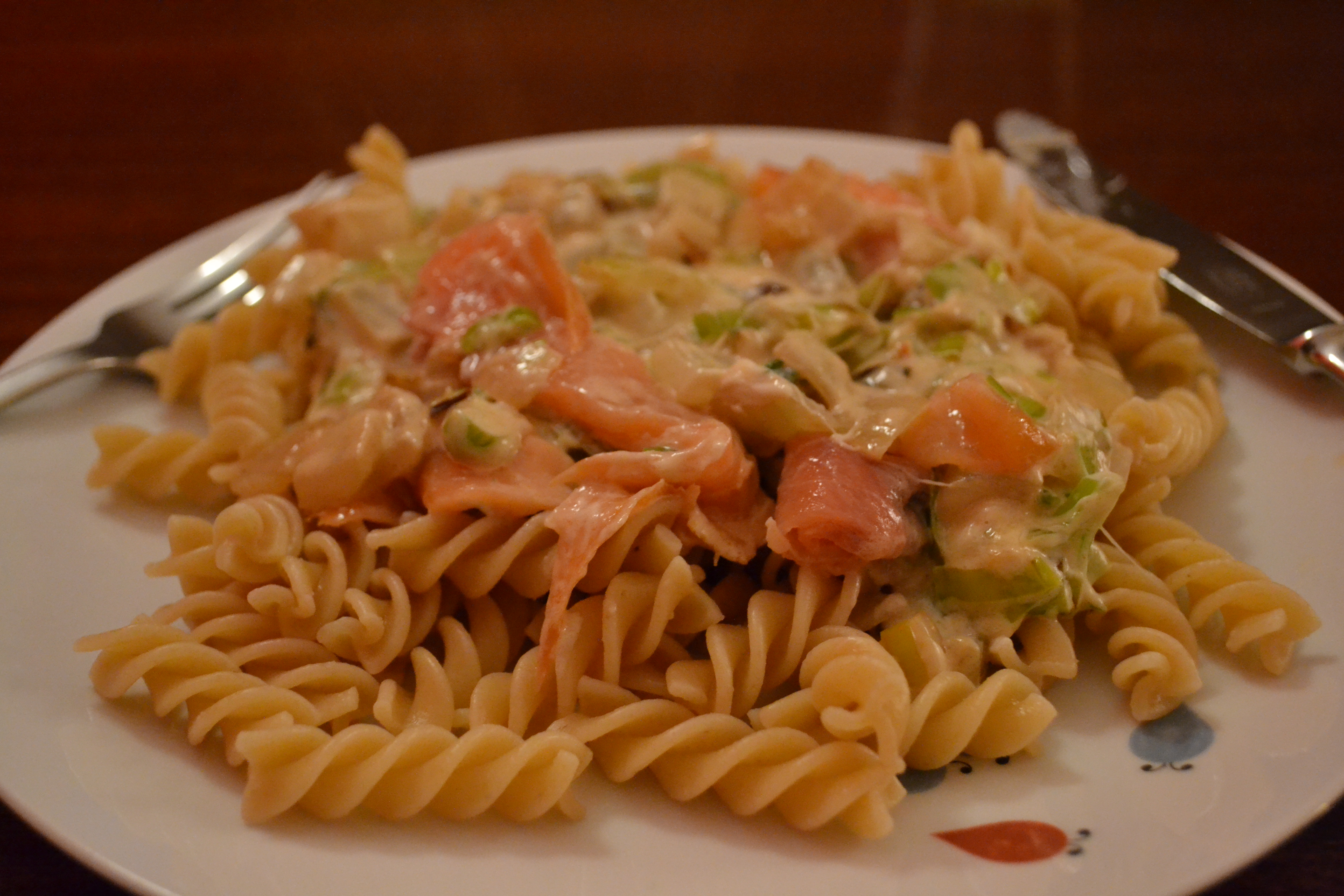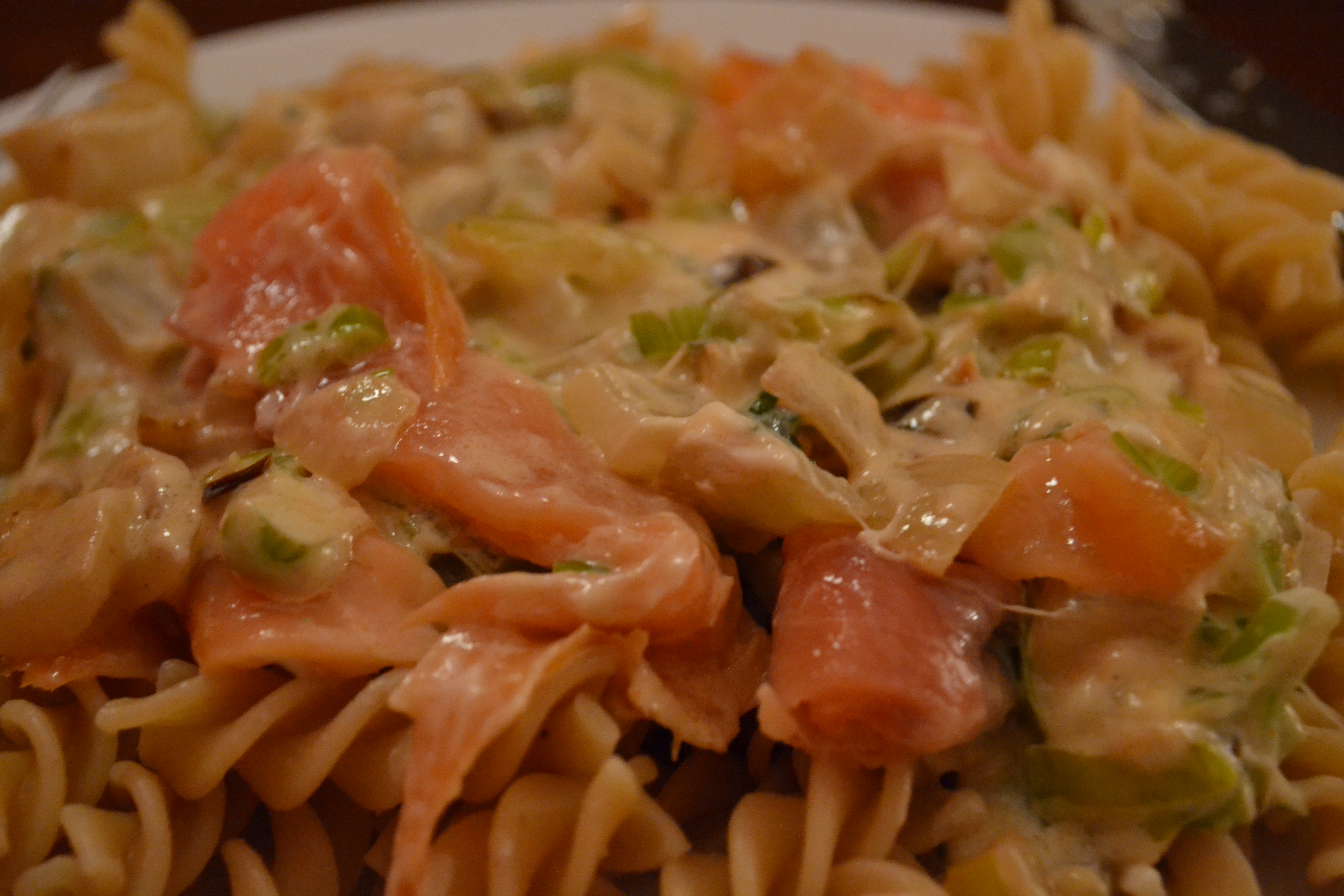 English: you should try smoked salmon on your pasta with some leek and sour cream. It is fast, delicious and so easy.