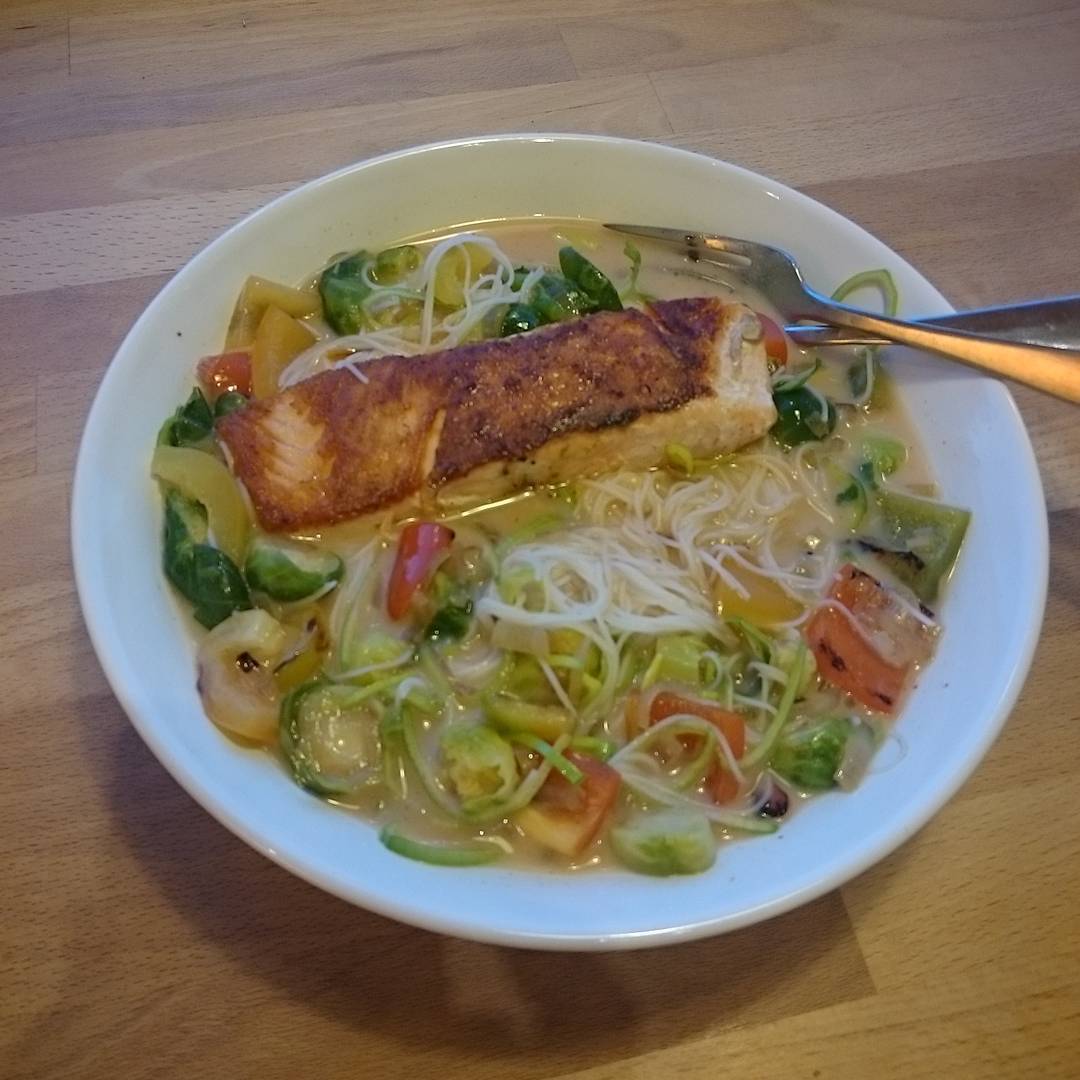 English: on Sunday I made this Asian noodle soup using everything I had at home and it turned out really well, so I am sharing the recipe. Fry salmon, fry onion and peppers. Boil vermicelli noodles with oil and chilli. Mix coconut milk and chilli in the noodles after you have poured out most of the water. Add chopped brussels sprouts and leek and the other greens. Serve in a bowl and add the salmon.