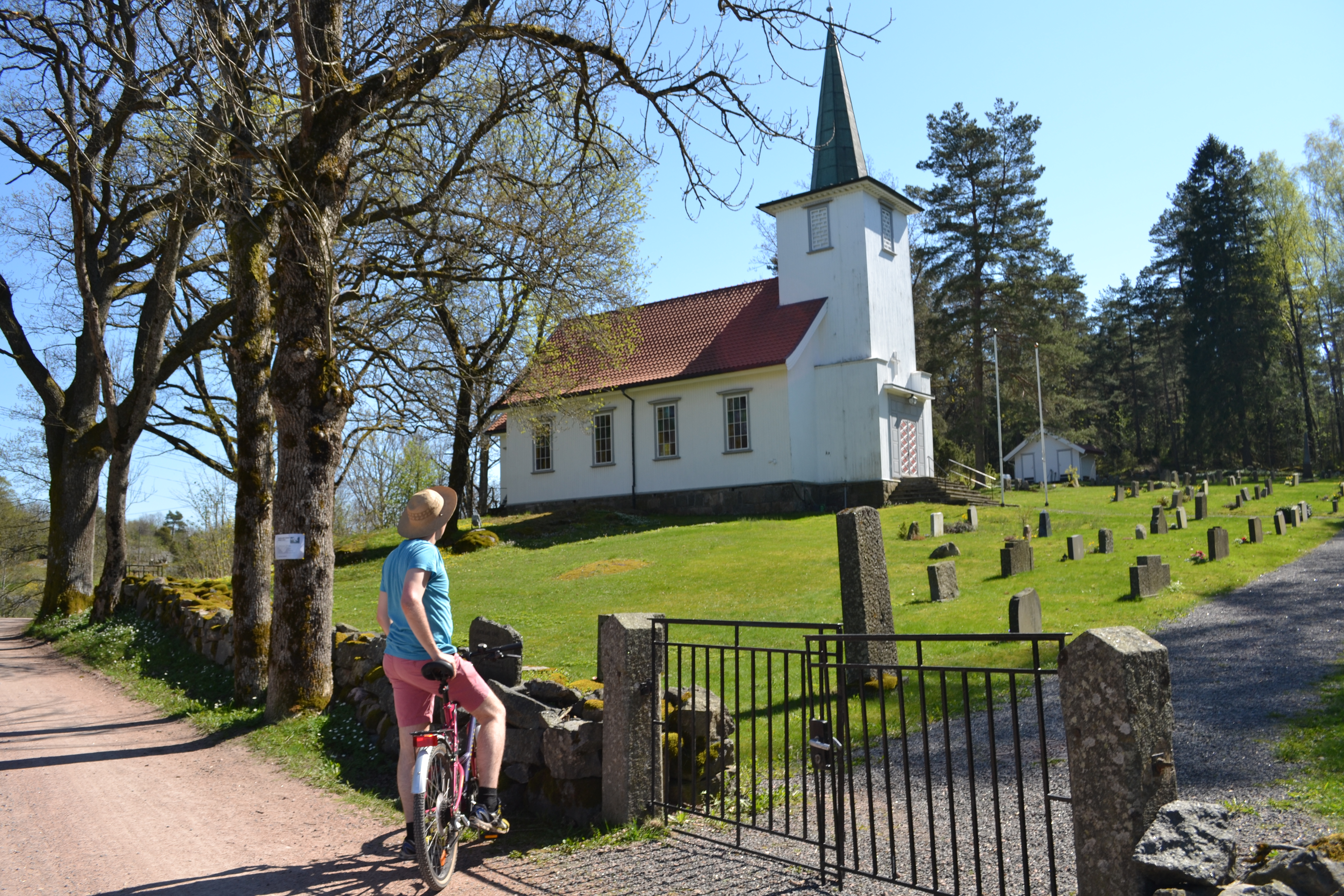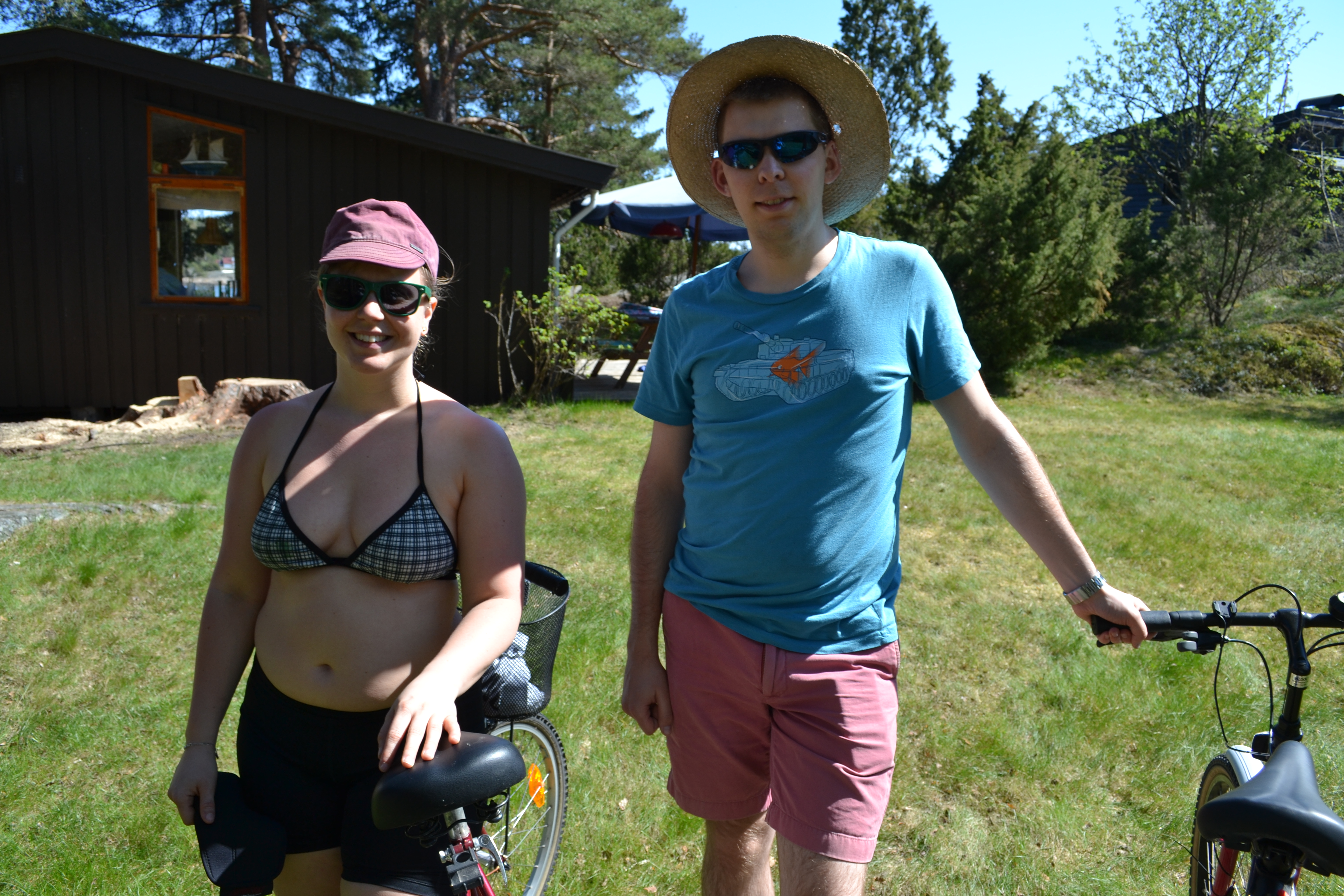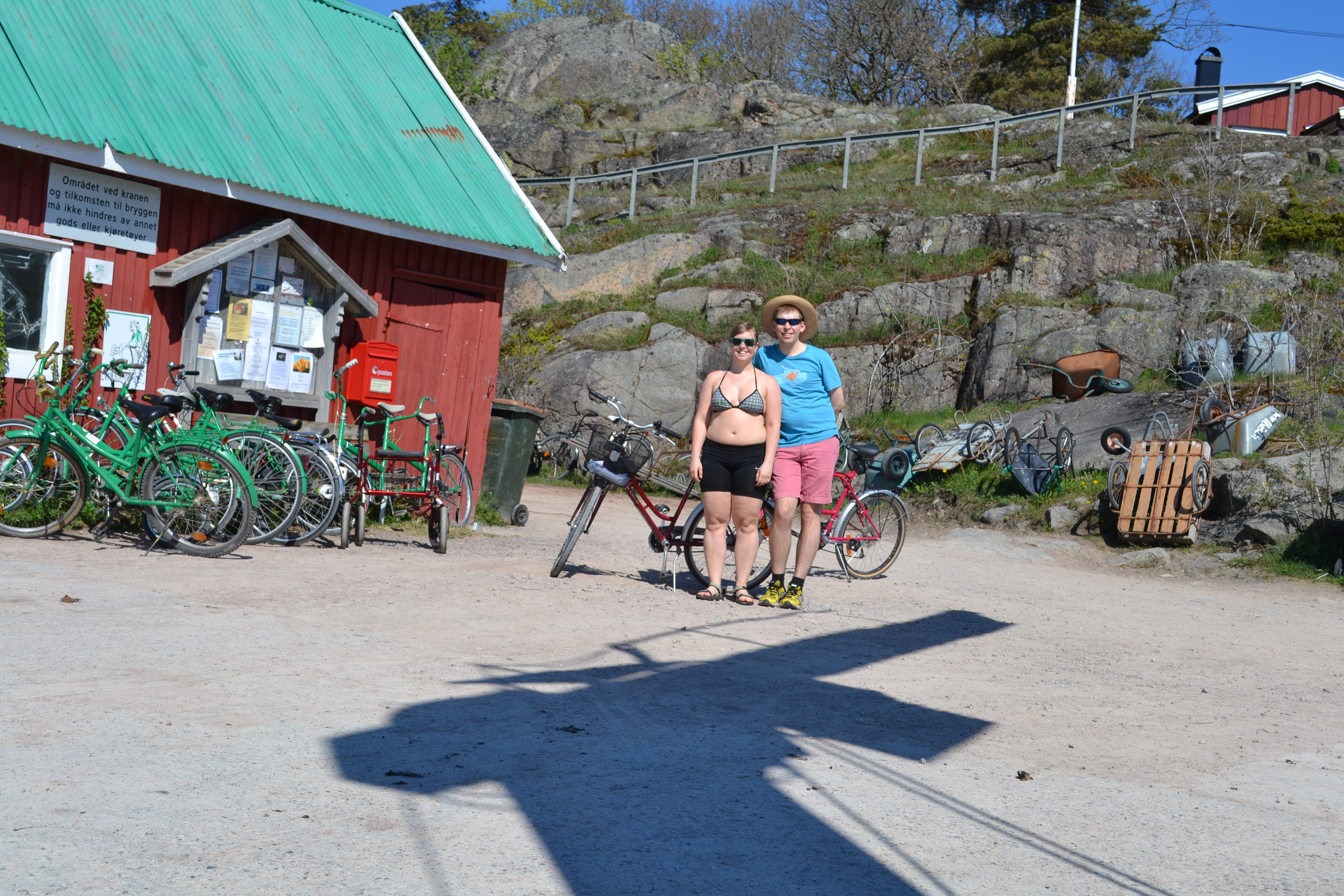 Vi syklet forbi kirka, sveitservillaer, sauer, til velhuset, postkontoret og stoppet ved Dagros, den lokale pøbben, restauranten og scenen på Veierland. Der tok vi en øl, satt i sola, spiste pizza til lønsj og syklet tilbake til hytta. Det var så deilig å sykle sånn i sommervarmen. Jeg håper vi får gjort det mer i sommer.