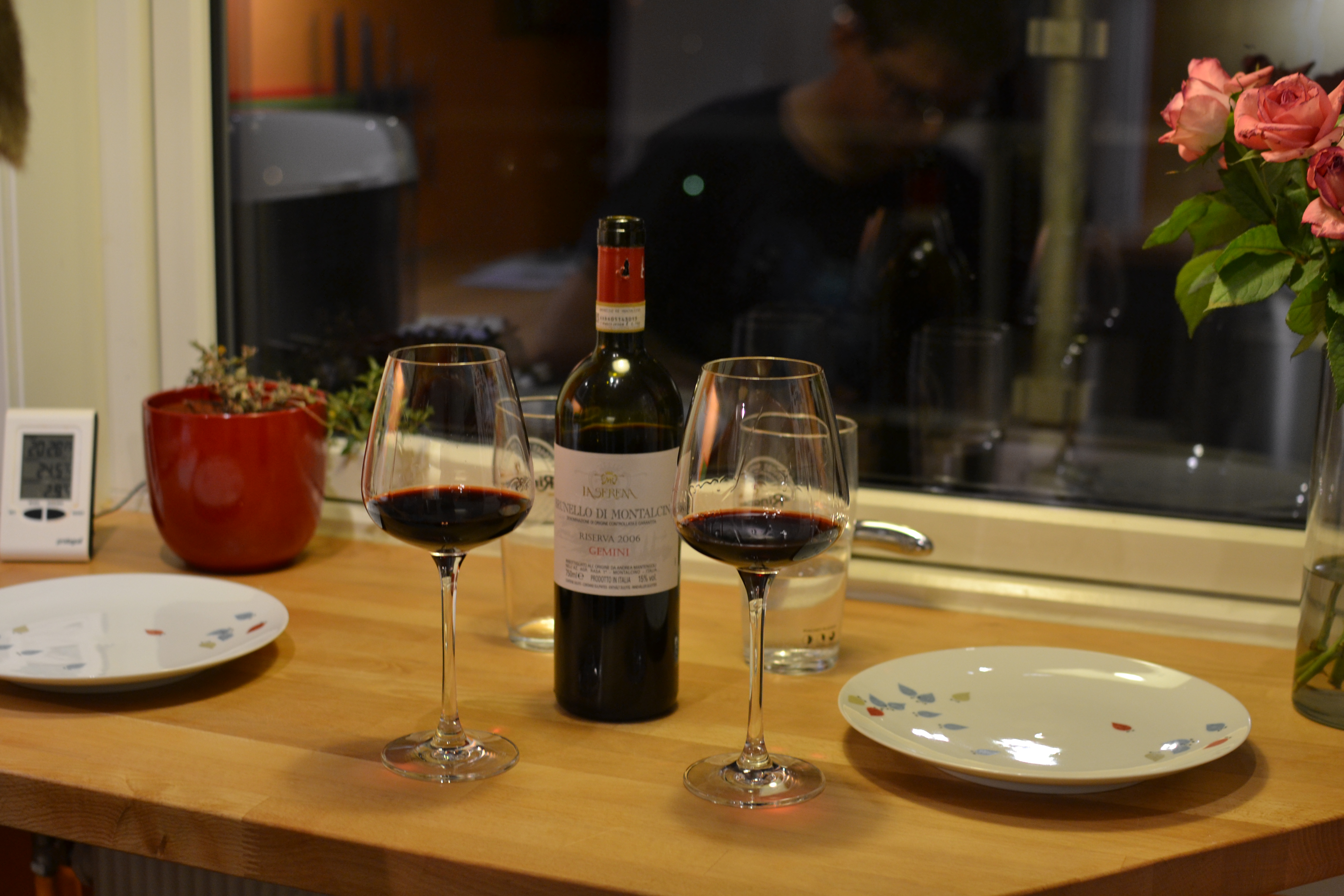 Det var en Brunello di Montalcino fra 2006 som vi kjøpte da vi var i Italia for tre år siden. Den kostet en liten formue, men vi har ikke vært flinke nok til å oppbevare den riktig, så vi har vært litt spent på hvordan den kom til å smake. Tenk om vi har ødelagt den og den smaker skrekkelig?