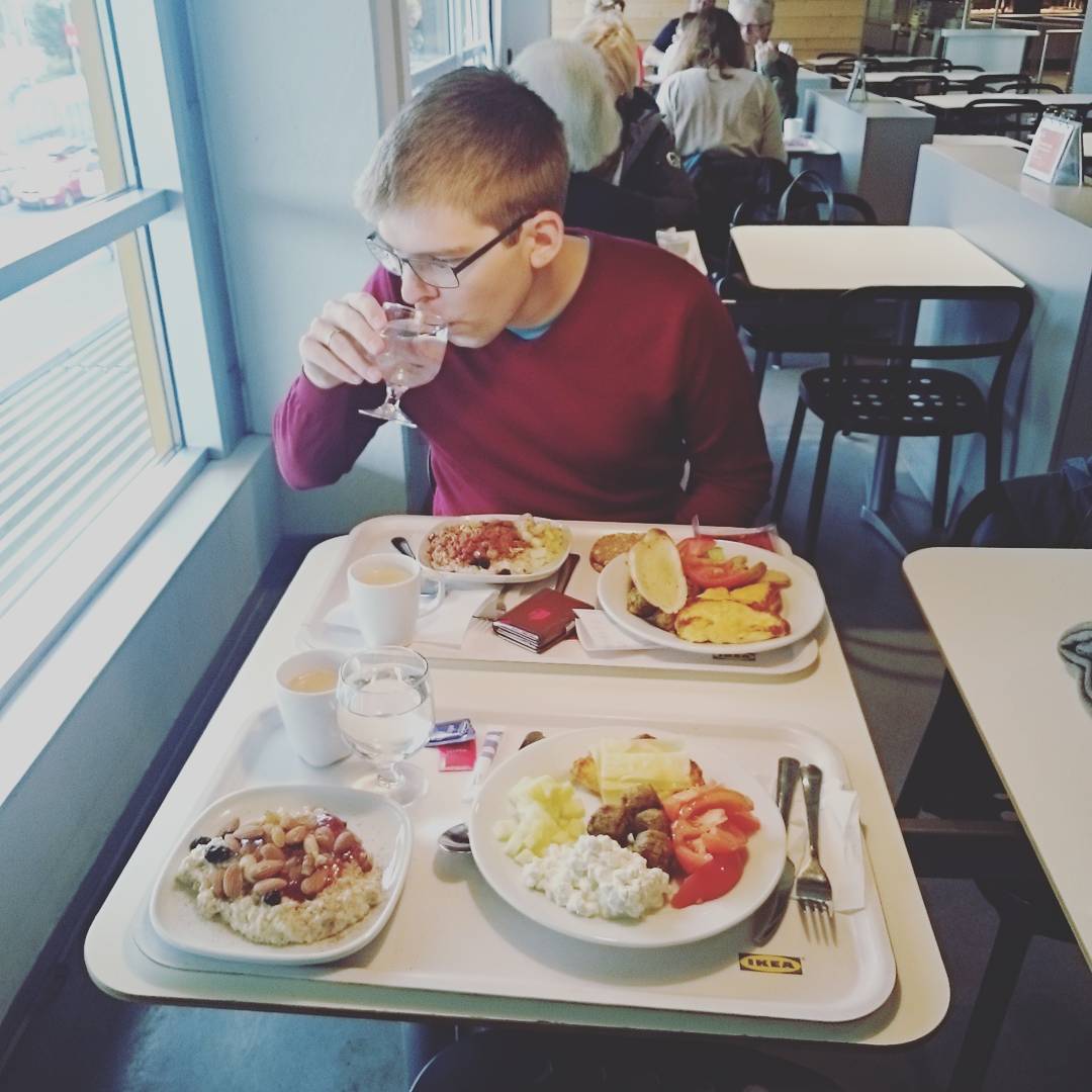Frokostbuffet på IKEA tidlig en lørdag morgen. Siste tenkeboks før vi bestemte oss for å kjøpe den nye, grønne sofaen