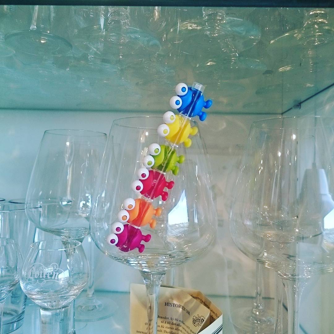 Bilde fra vitrineskapet og nye vinglassmarkører som vi fikk på vernissasjen av Gro