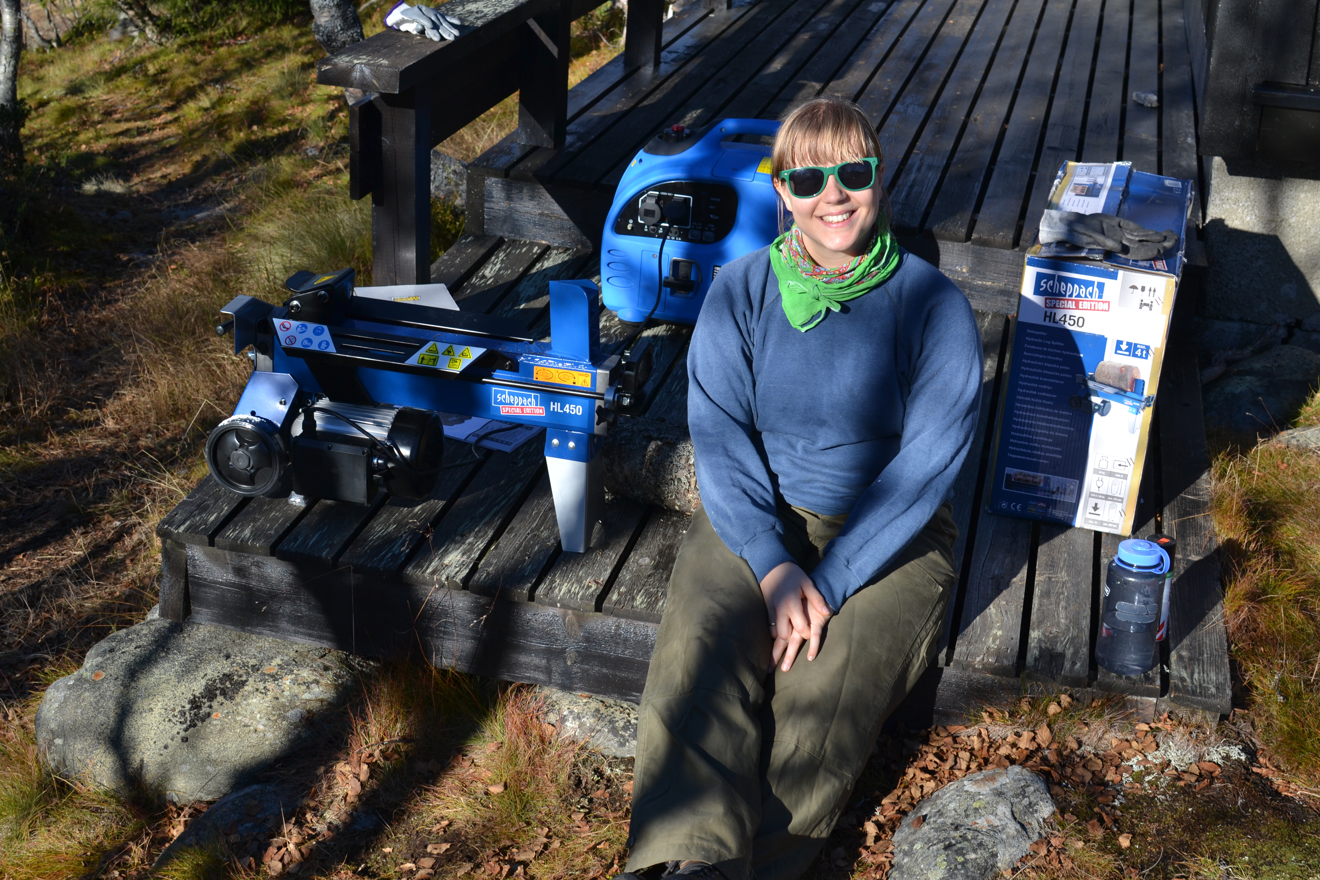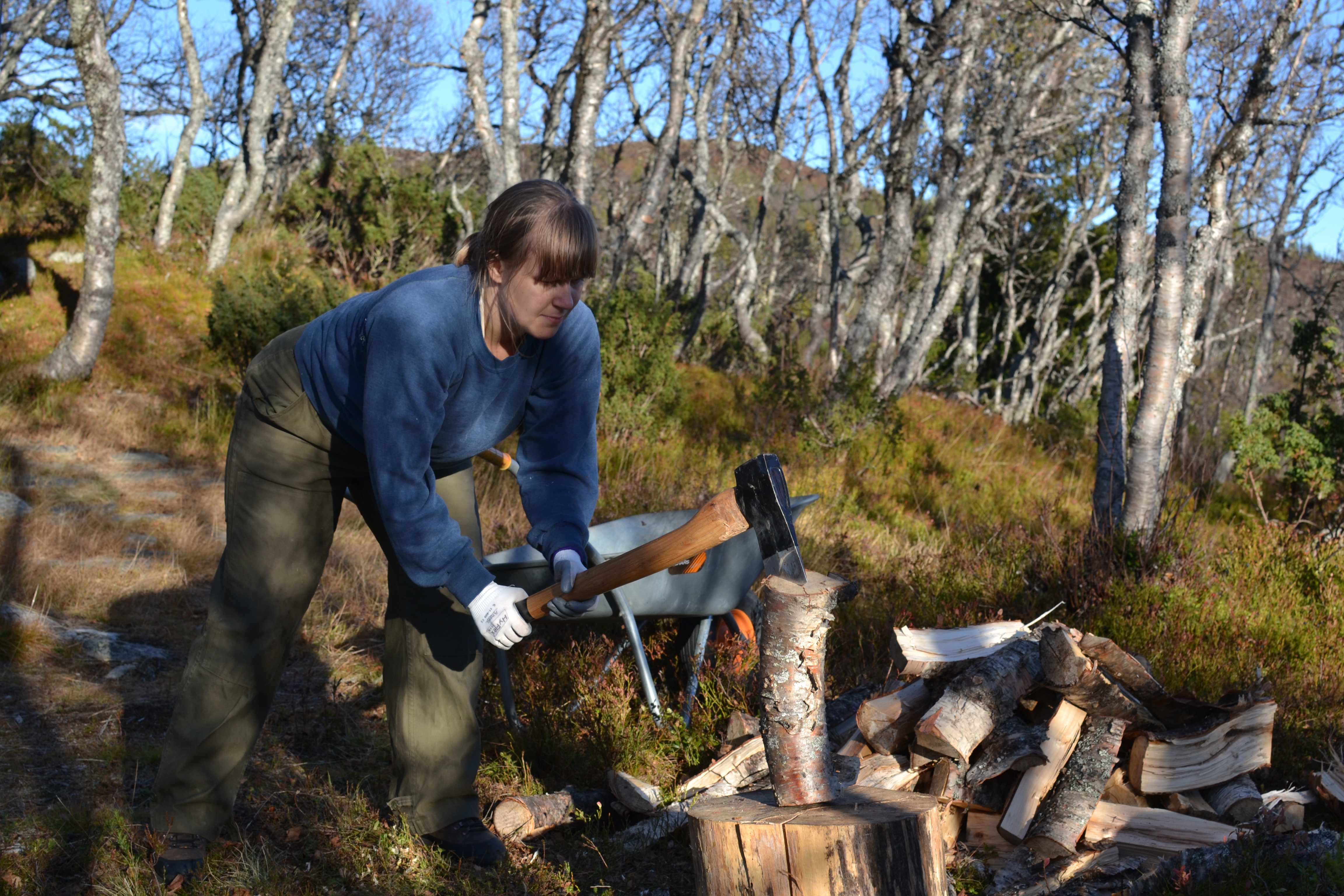 Neste dag spiste vi frokost i strålende solskinn og gjorde oss klare for vedkløyving.
