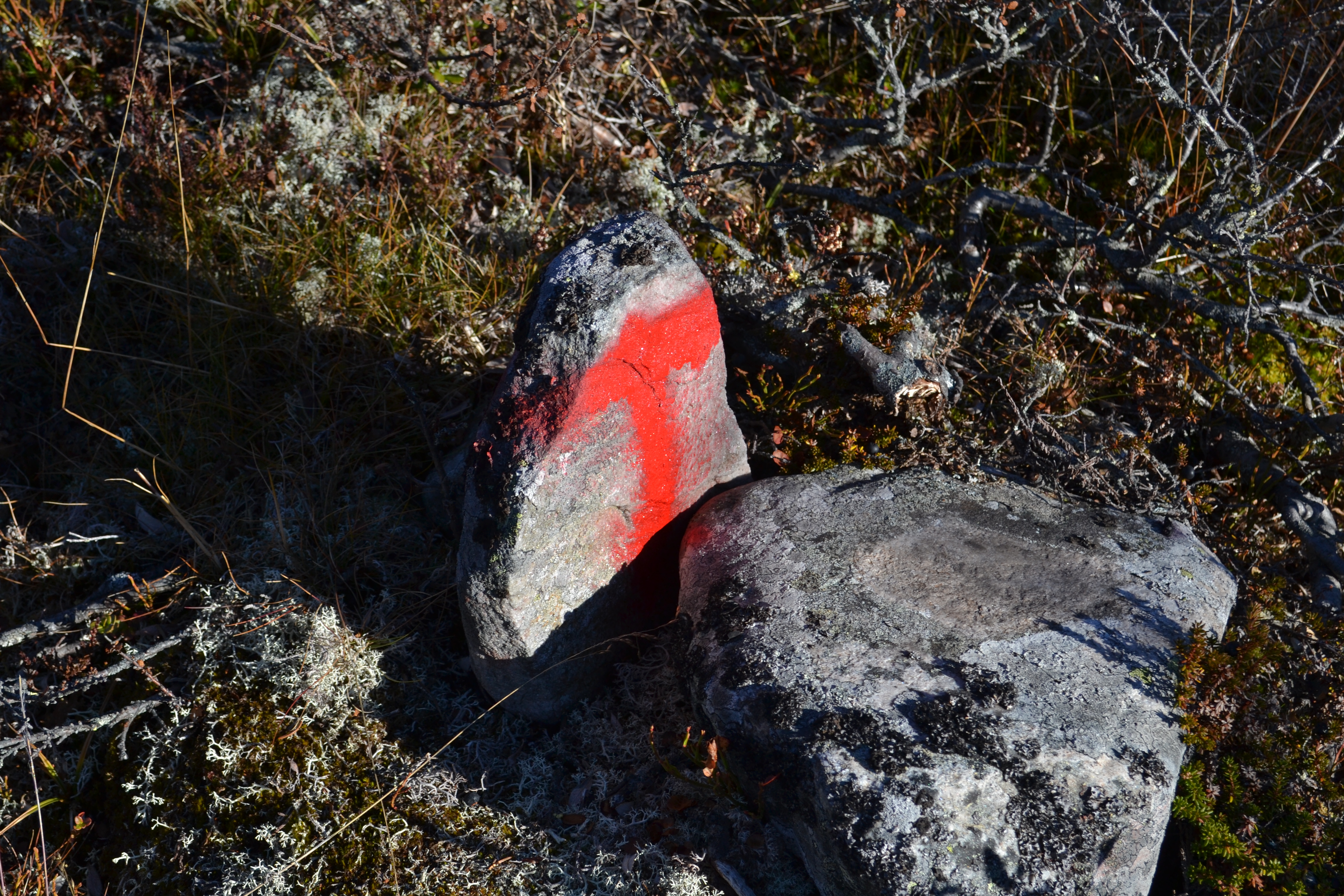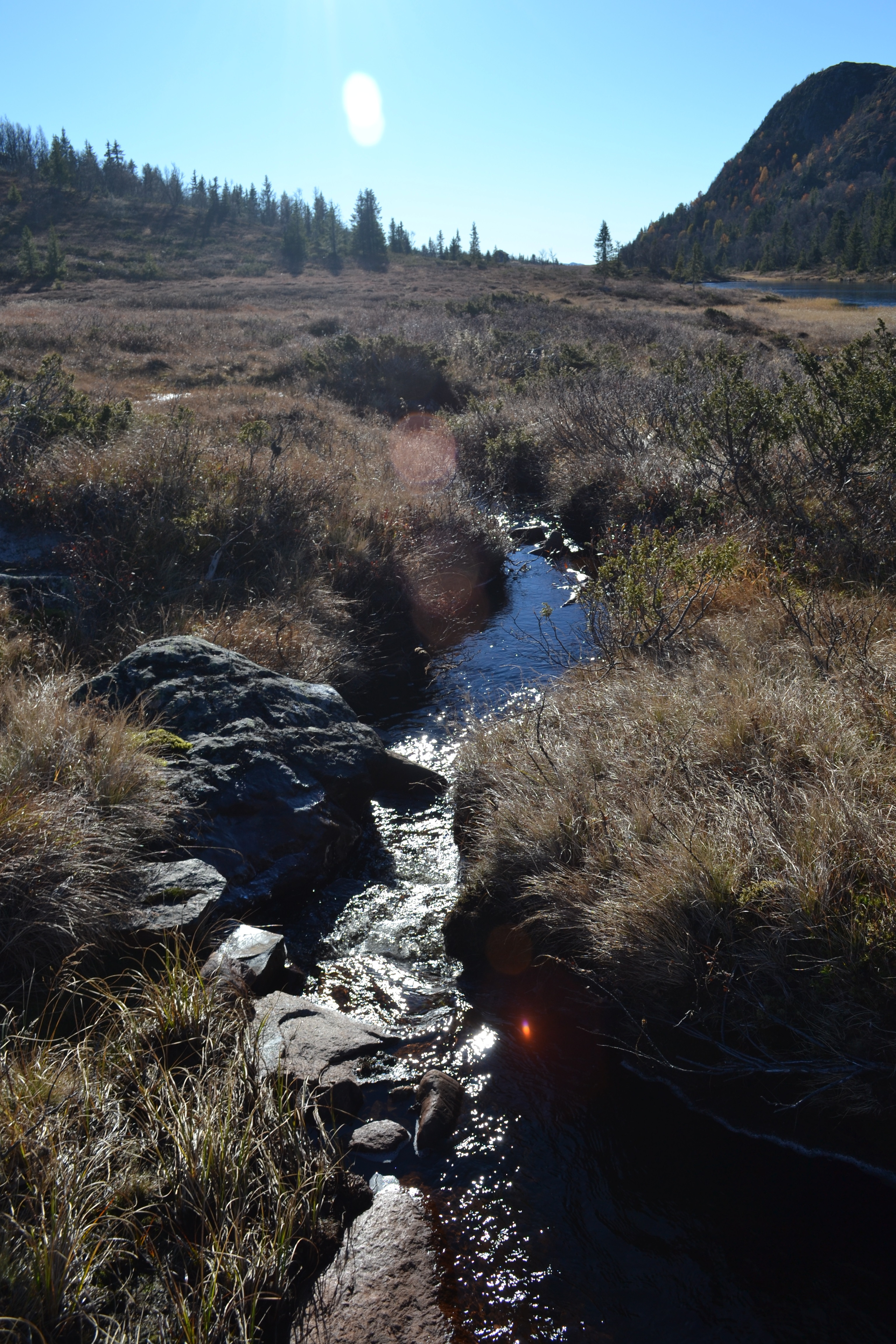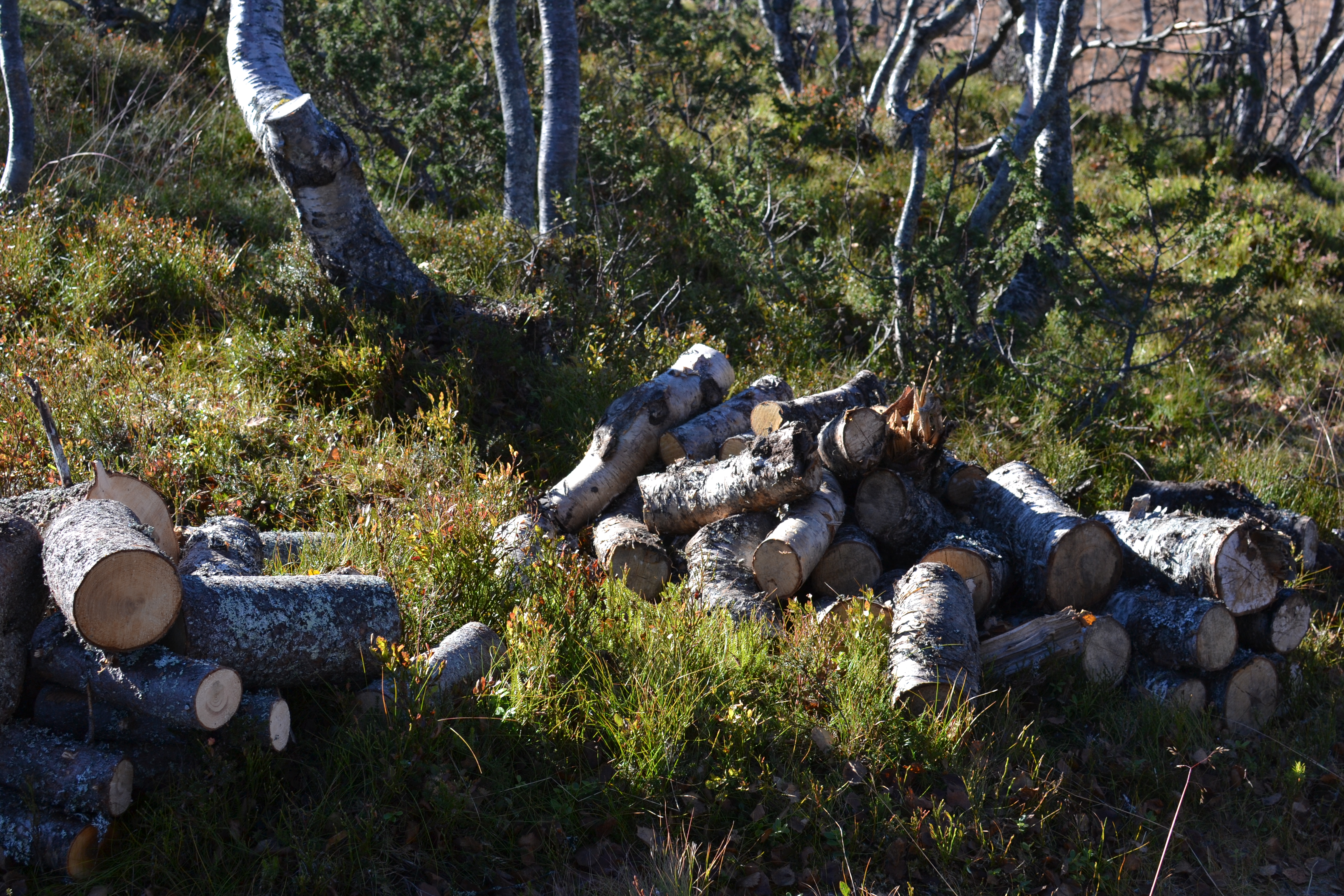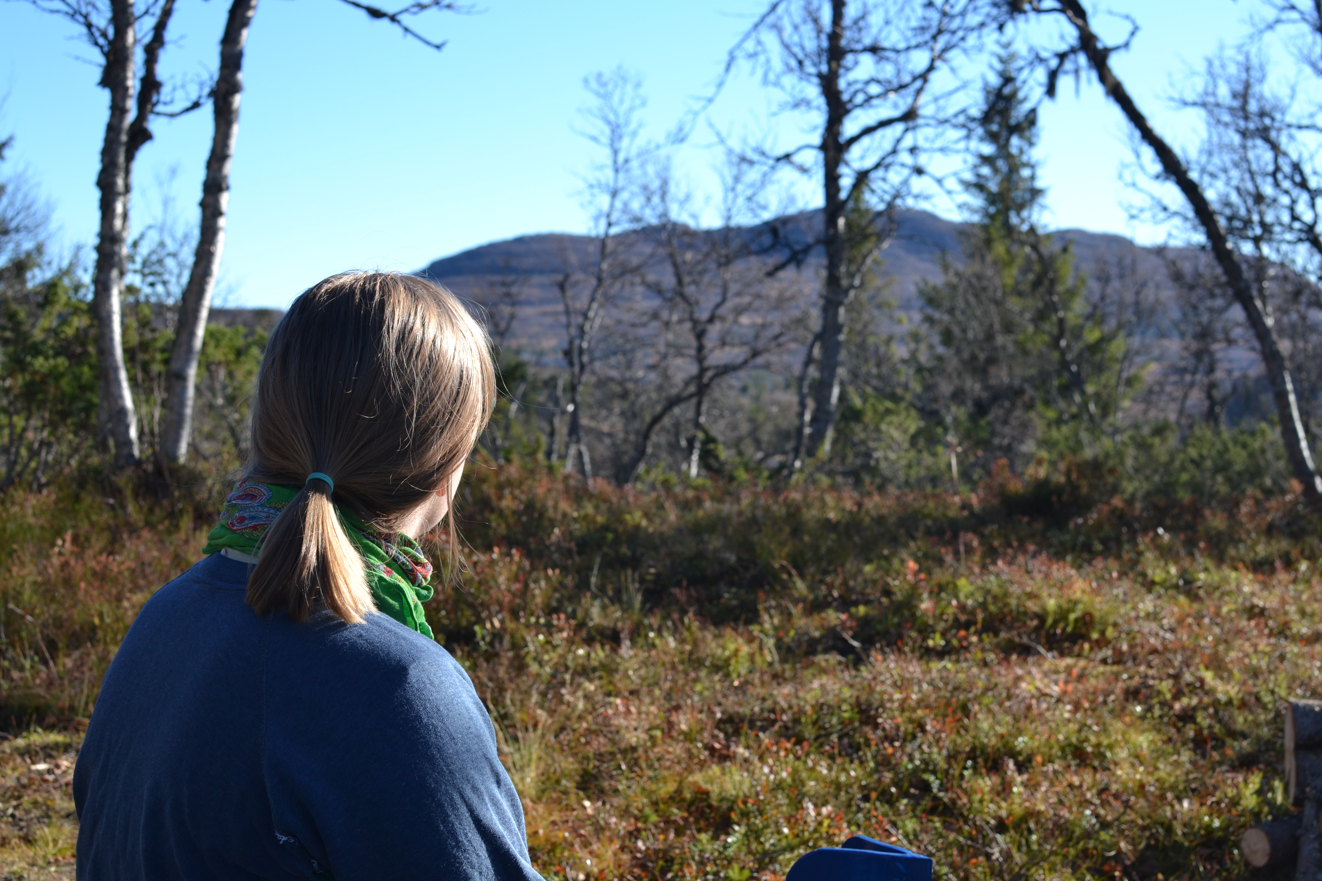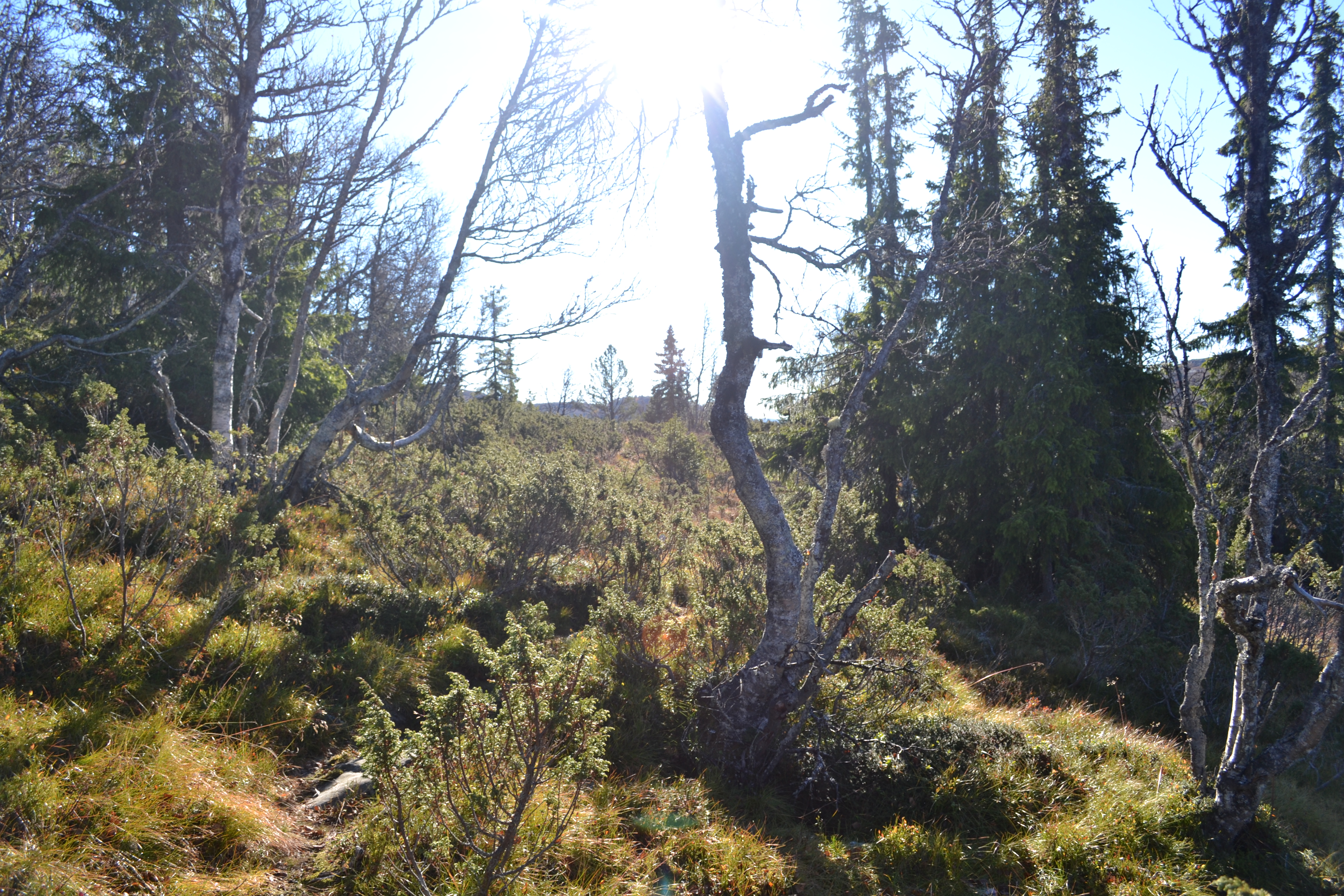Etter å ha båret, stablet og kløyvd ved hele lørdag var det på tide å komme seg ut på tur på søndagen. Ettersom det var frost i bakken bestemte vi oss for å gå oppover langs myrene, der det ikke er sti. Det er godt å se litt andre ting og det er ikke så mange stier i området, for folk går for det meste på ski her.