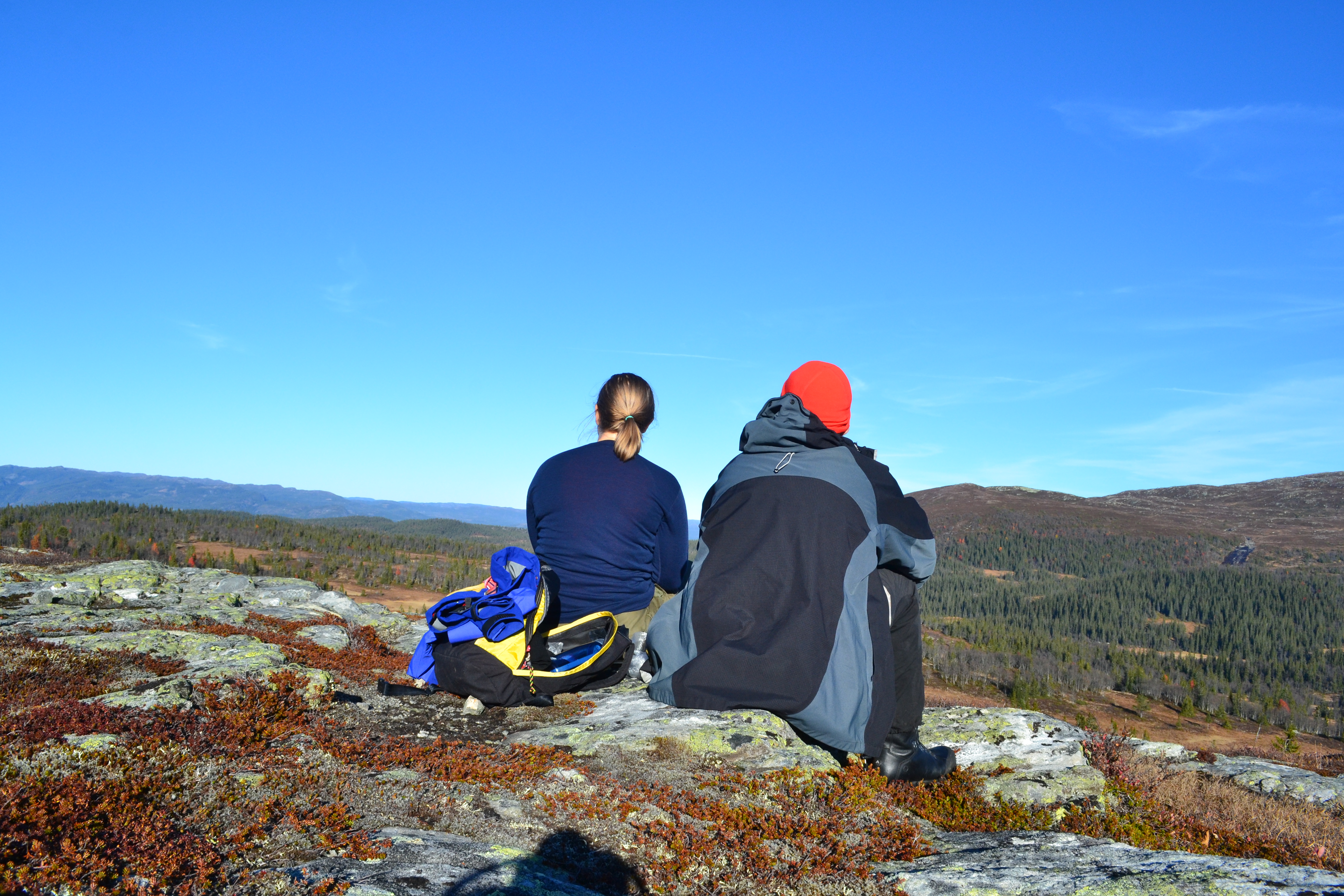 Det ble lønsj oppe på Toveåsen, her sitter vi og funderer på hvilke hvite fjell vi ser i det fjerne. Vi trenger en app som kan fortelle sånt.