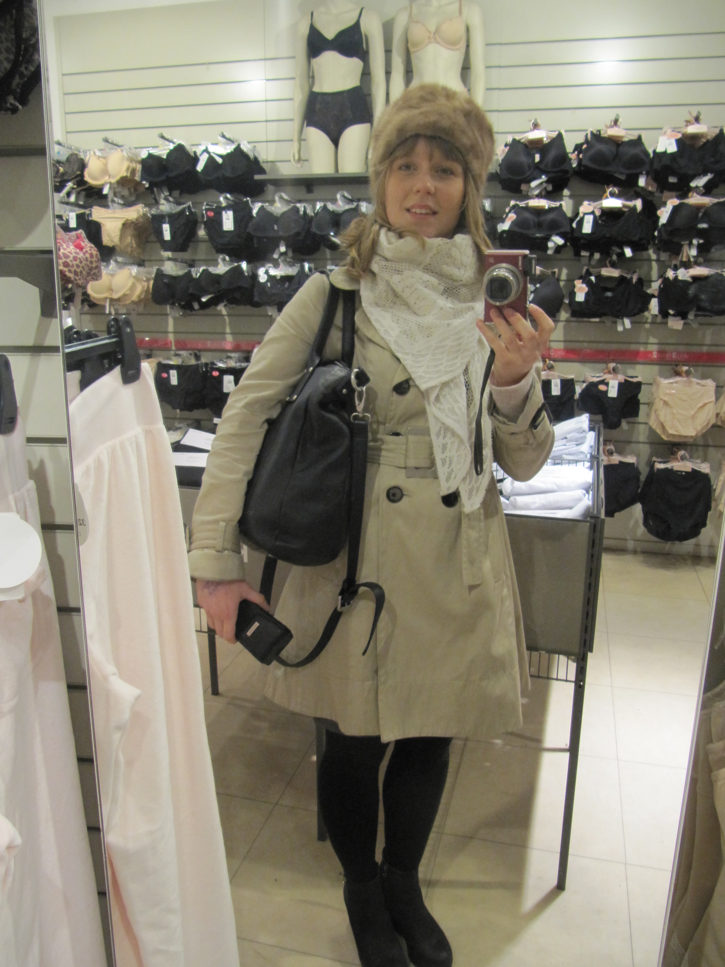 Jeg bodde i veska mi hele dagen og siden den var så tung måtte jeg få den over skulderen. Og siden det ikke går med den nye cepen ble det trenchcoat på tur. Men det funka bra, det 😉