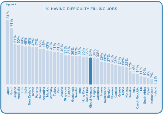My friend Juho from Finland linked to this article about unemployability for youth (up to 30 years). As you all probably know the unemployment levels for youth in Spain and Greece are over 50% and more European countries are well over 30%. This is all baffling for a Norwegian like myself, but I have to admit that what really grabbed my attention was this graph made by Manpower Group Global Talent Shortage Survey 2012: