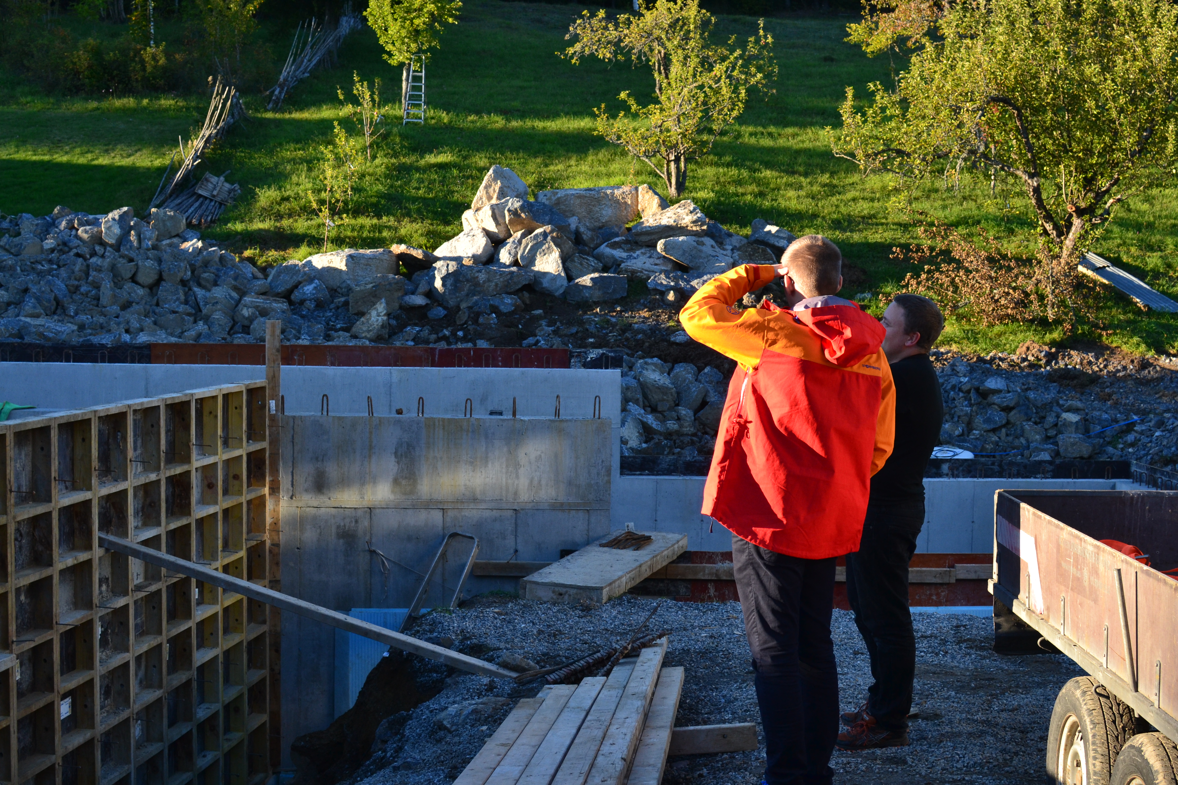 Det var snø på jordet, men den var sammenpakket og det var skare, så det gikk fint å gå på den selv med småsko. Her er ølsmakegjengen fra kvelden før og Jon Martin som kom innom på morgenkvisten for å mekke litt i boden 😉