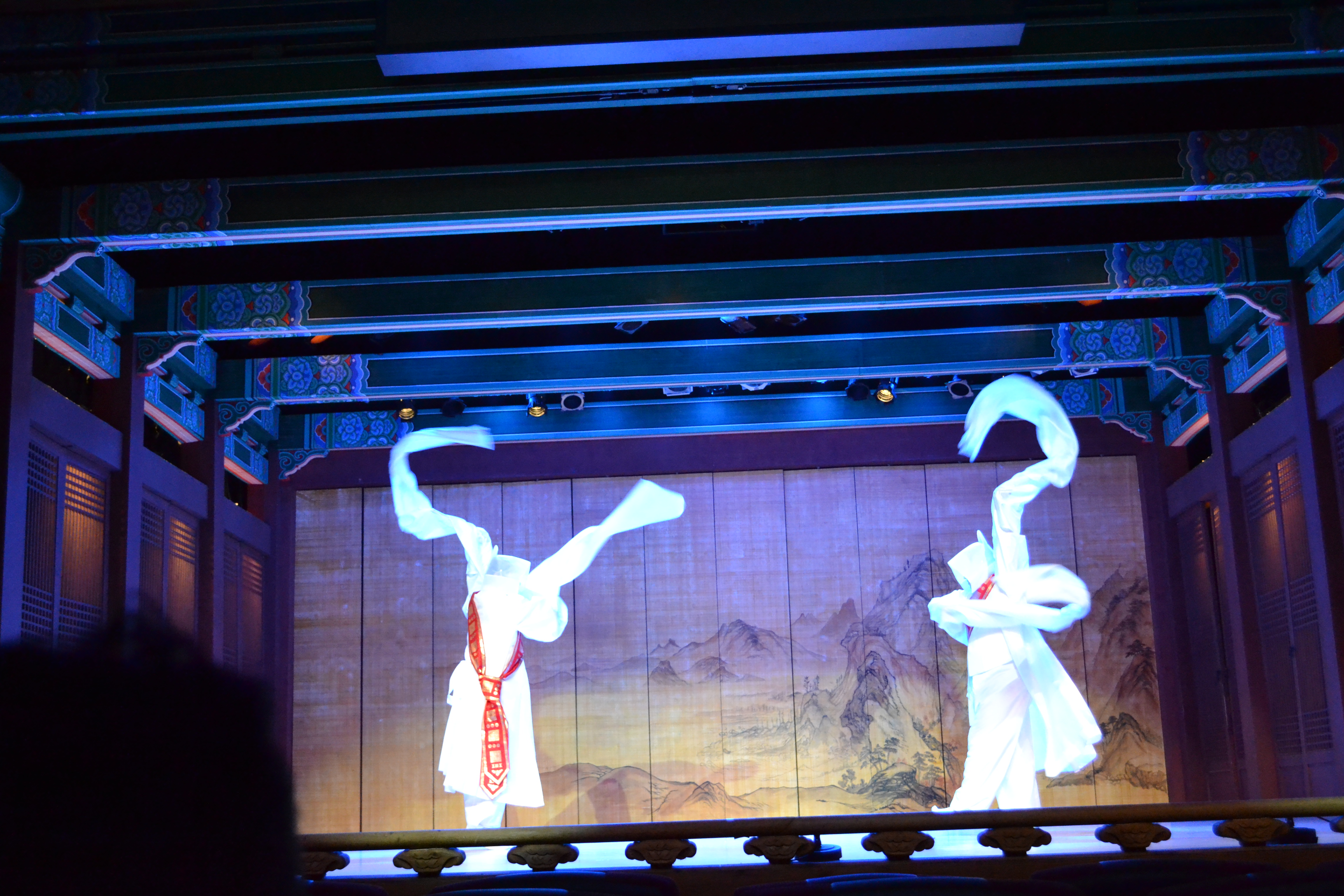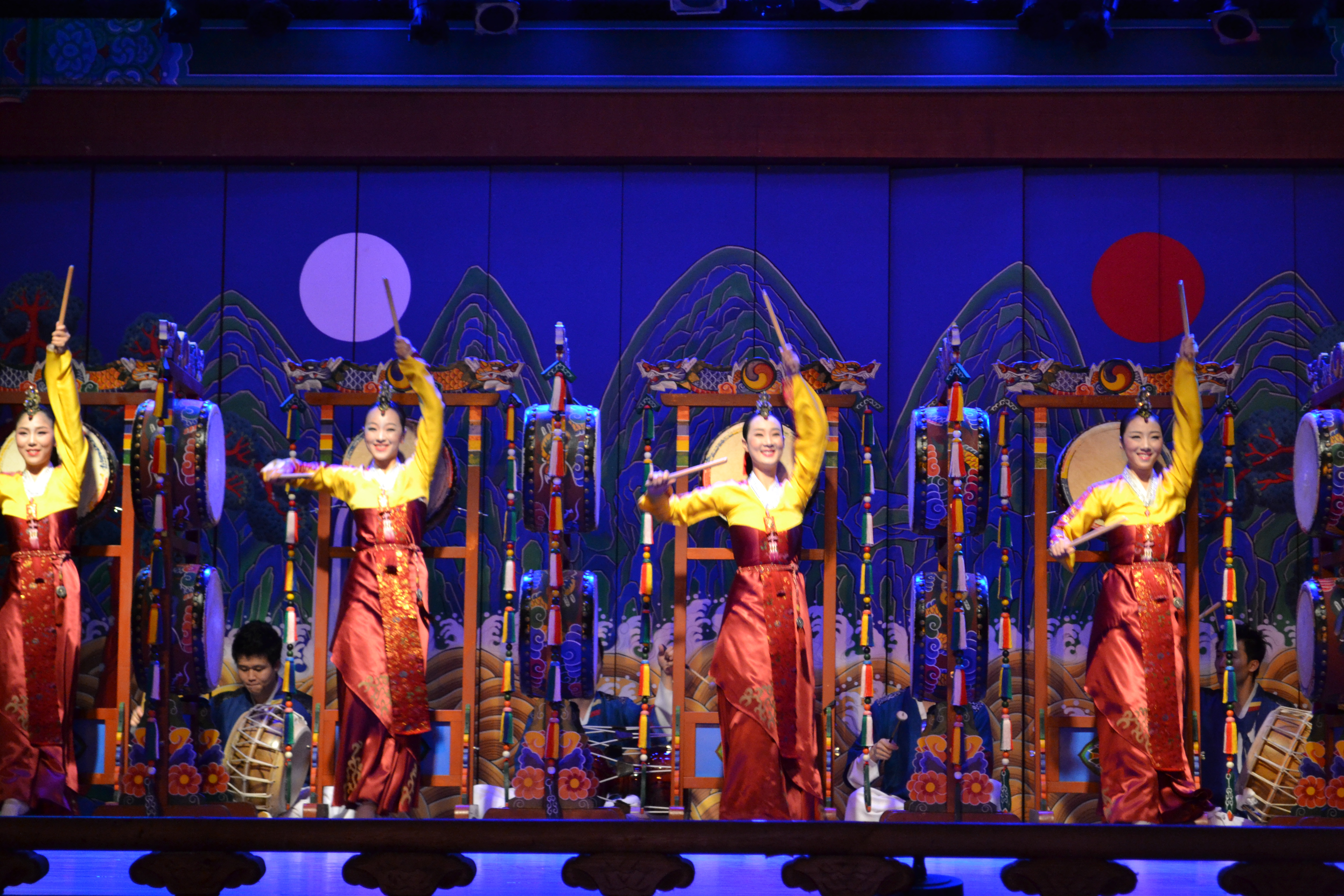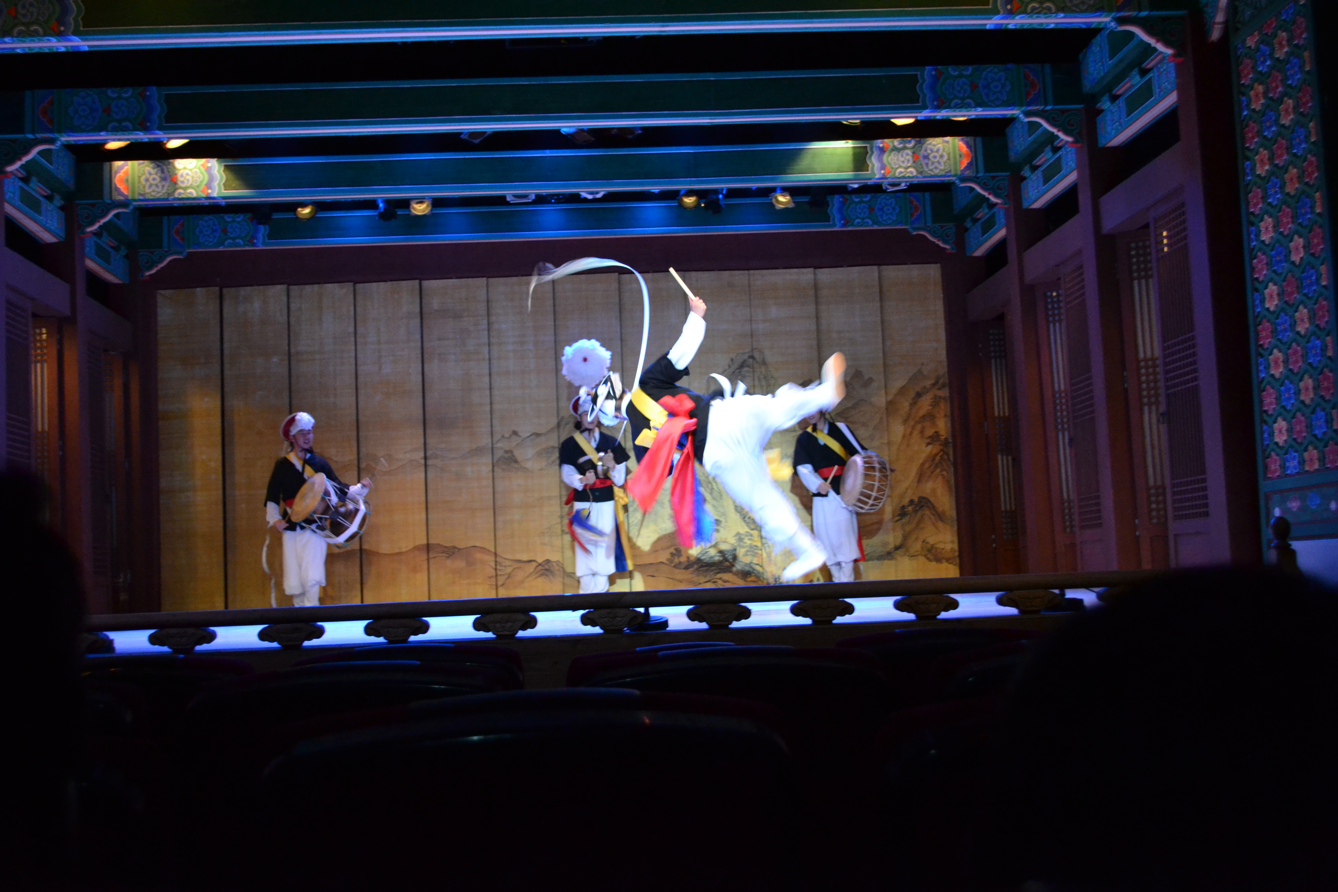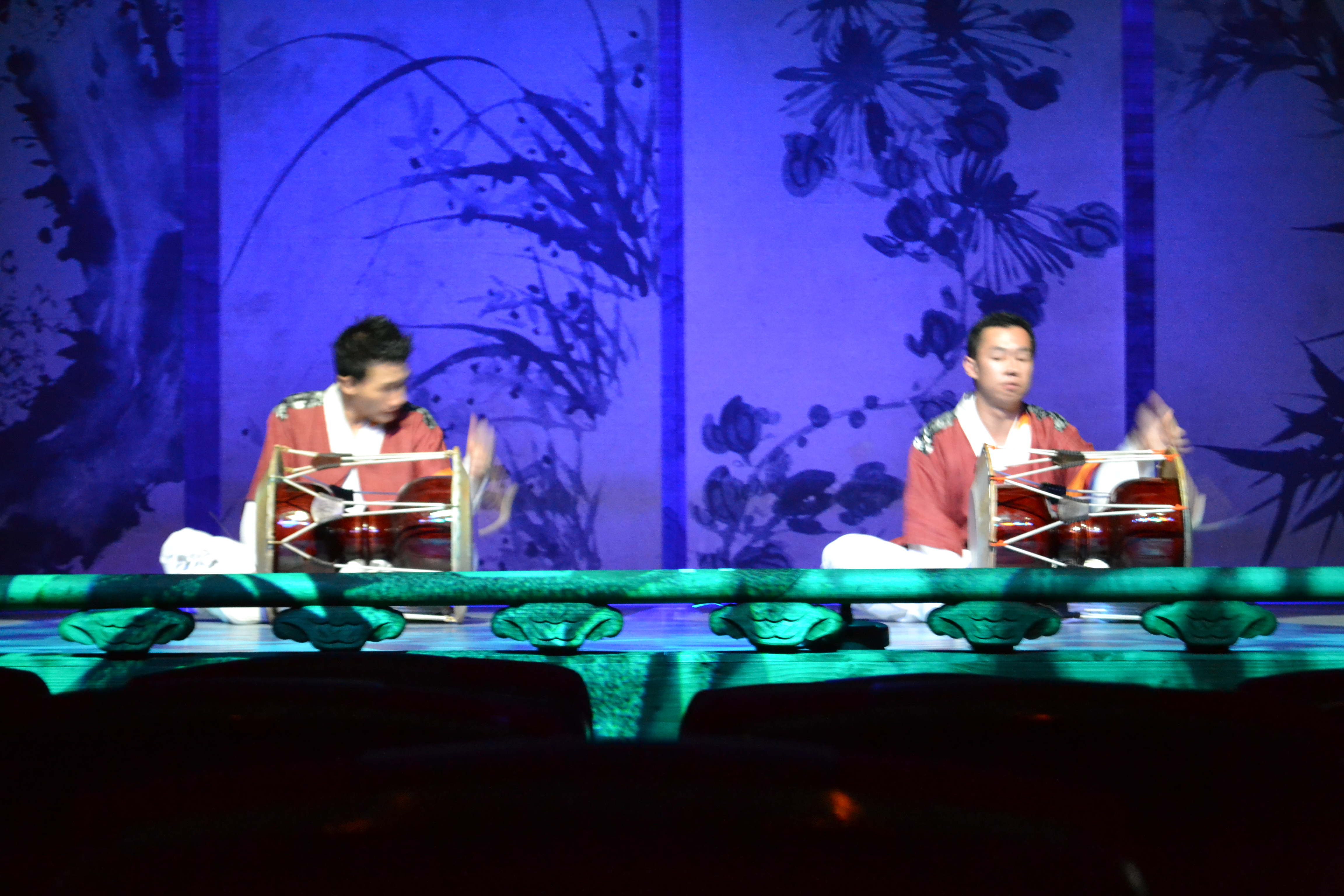 And here starts the show. We saw a show that sort of sums up many different traditional arts, and every day there is a different combination of artists. I guess they have other things to do as well. This is the traditional drum dance, where each dancer has five (as here) or three drums. This is actually used in a music video of a k-pop band (2:40).