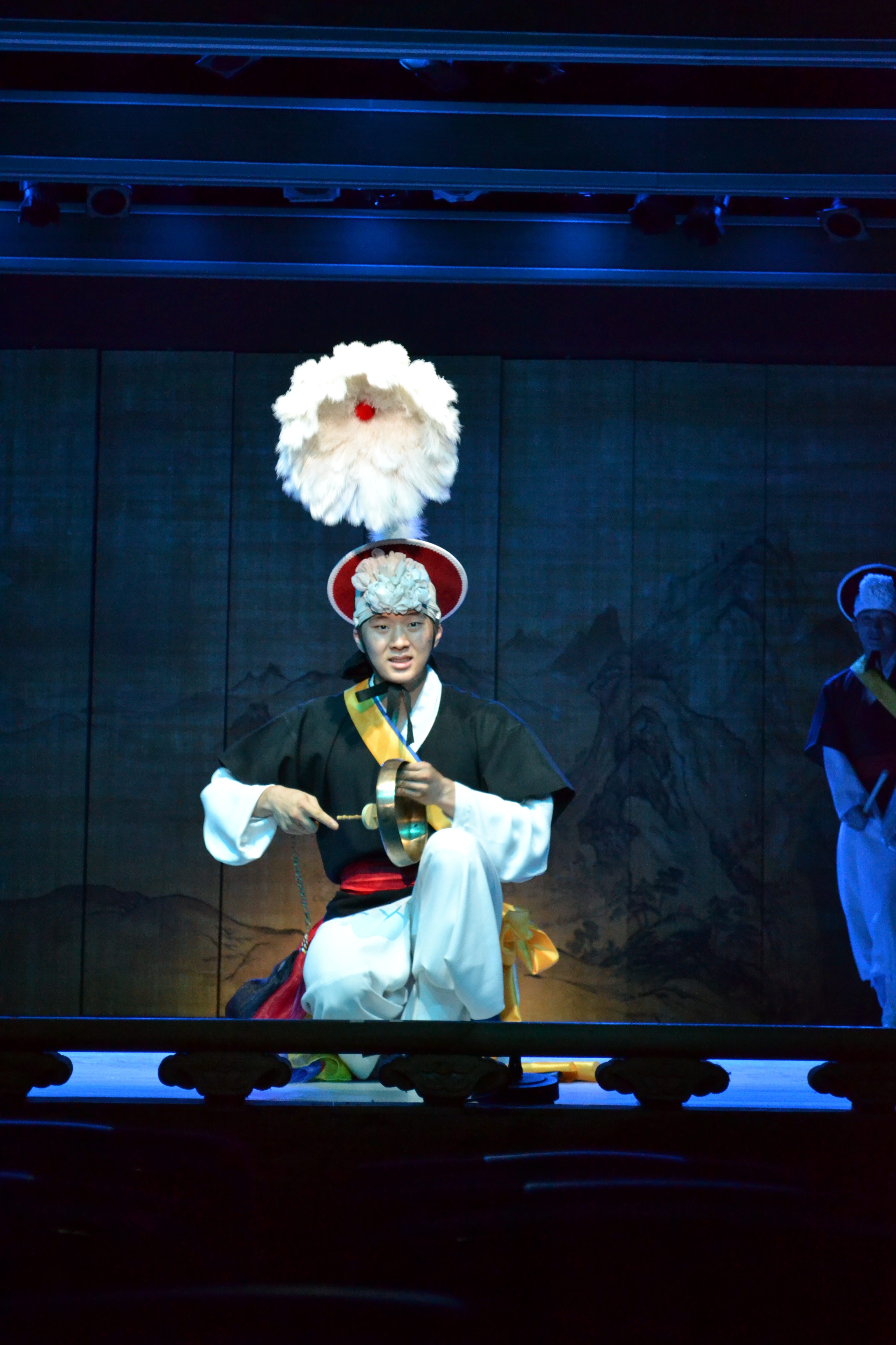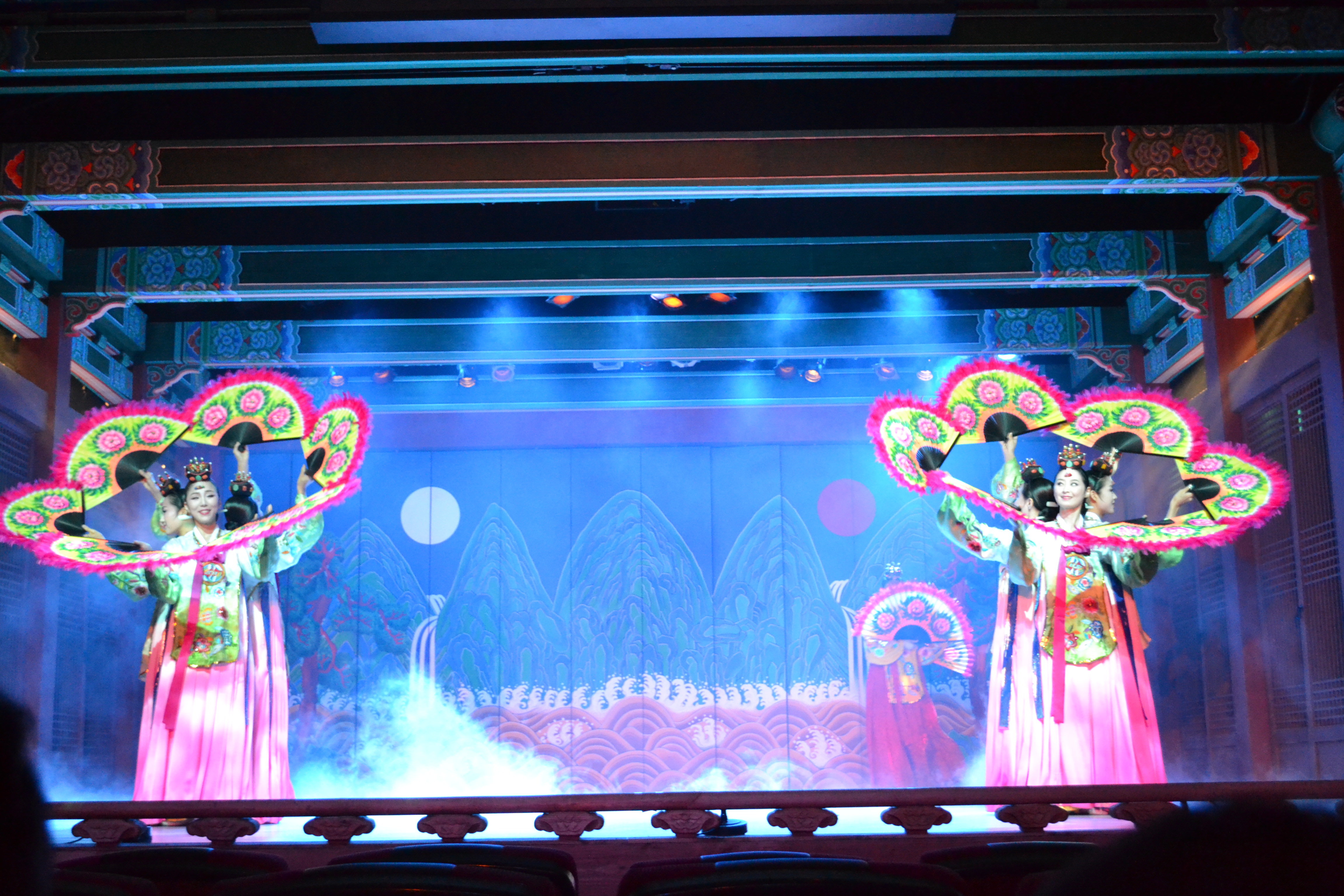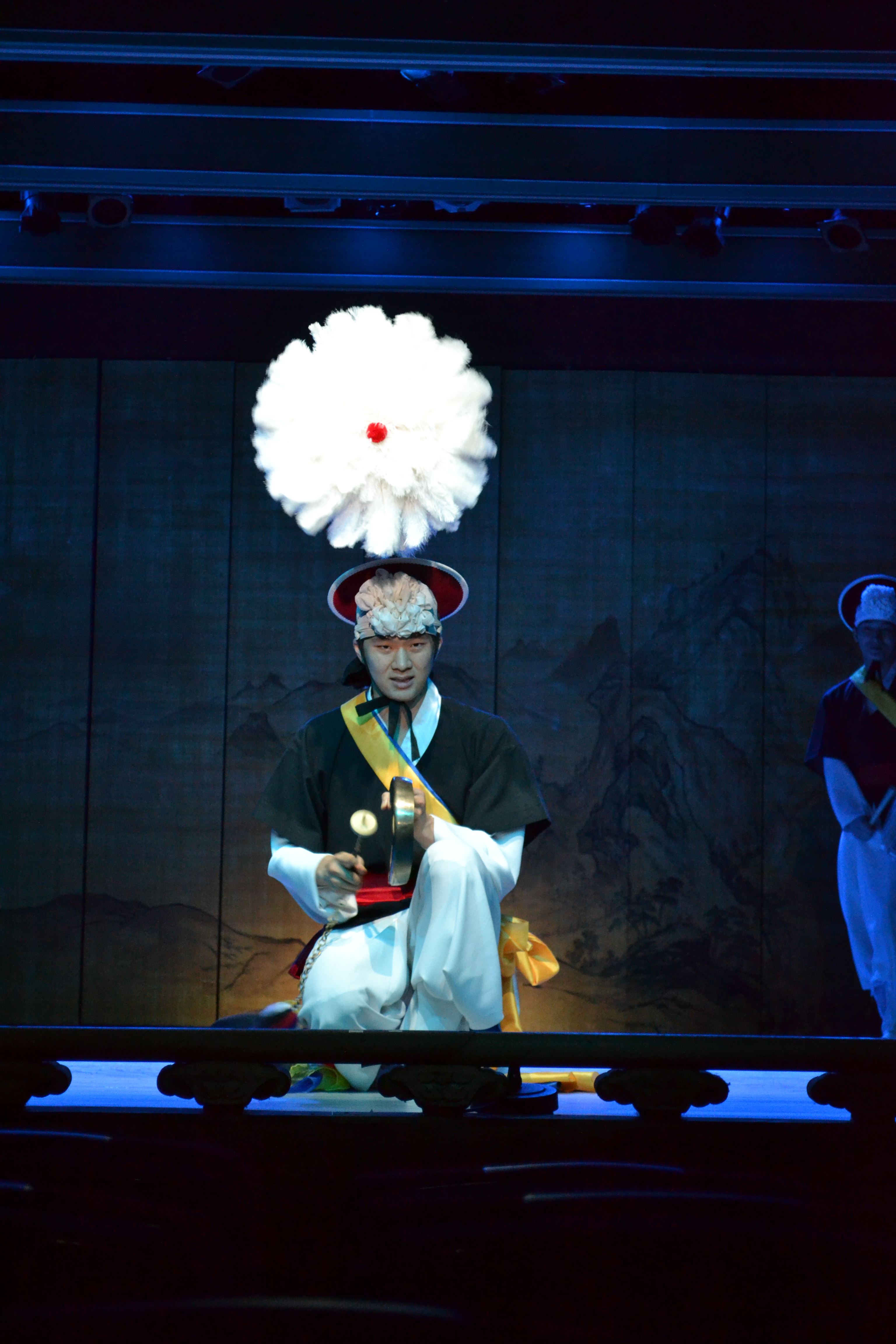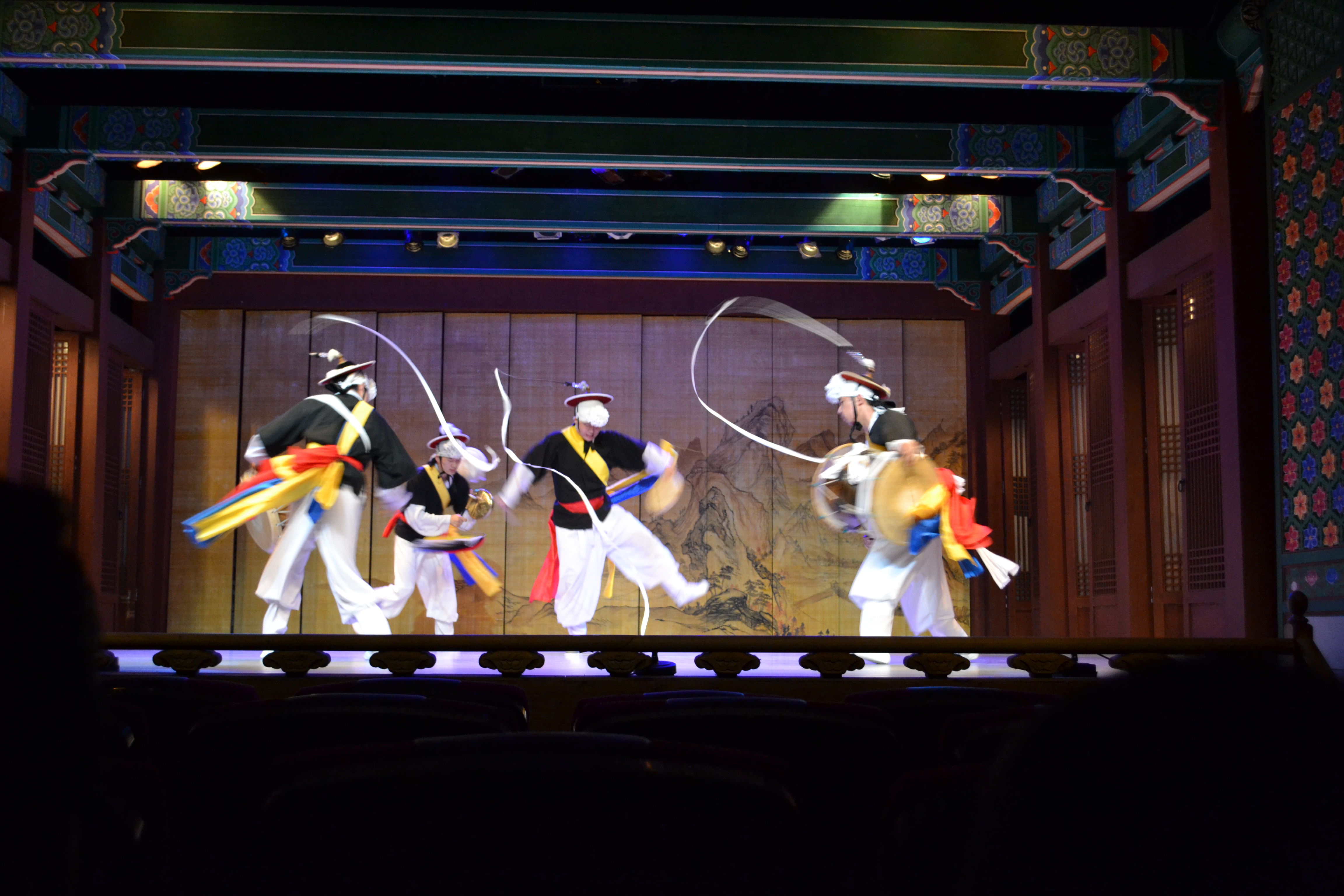 And here starts the show. We saw a show that sort of sums up many different traditional arts, and every day there is a different combination of artists. I guess they have other things to do as well. This is the traditional drum dance, where each dancer has five (as here) or three drums. This is actually used in a music video of a k-pop band (2:40).