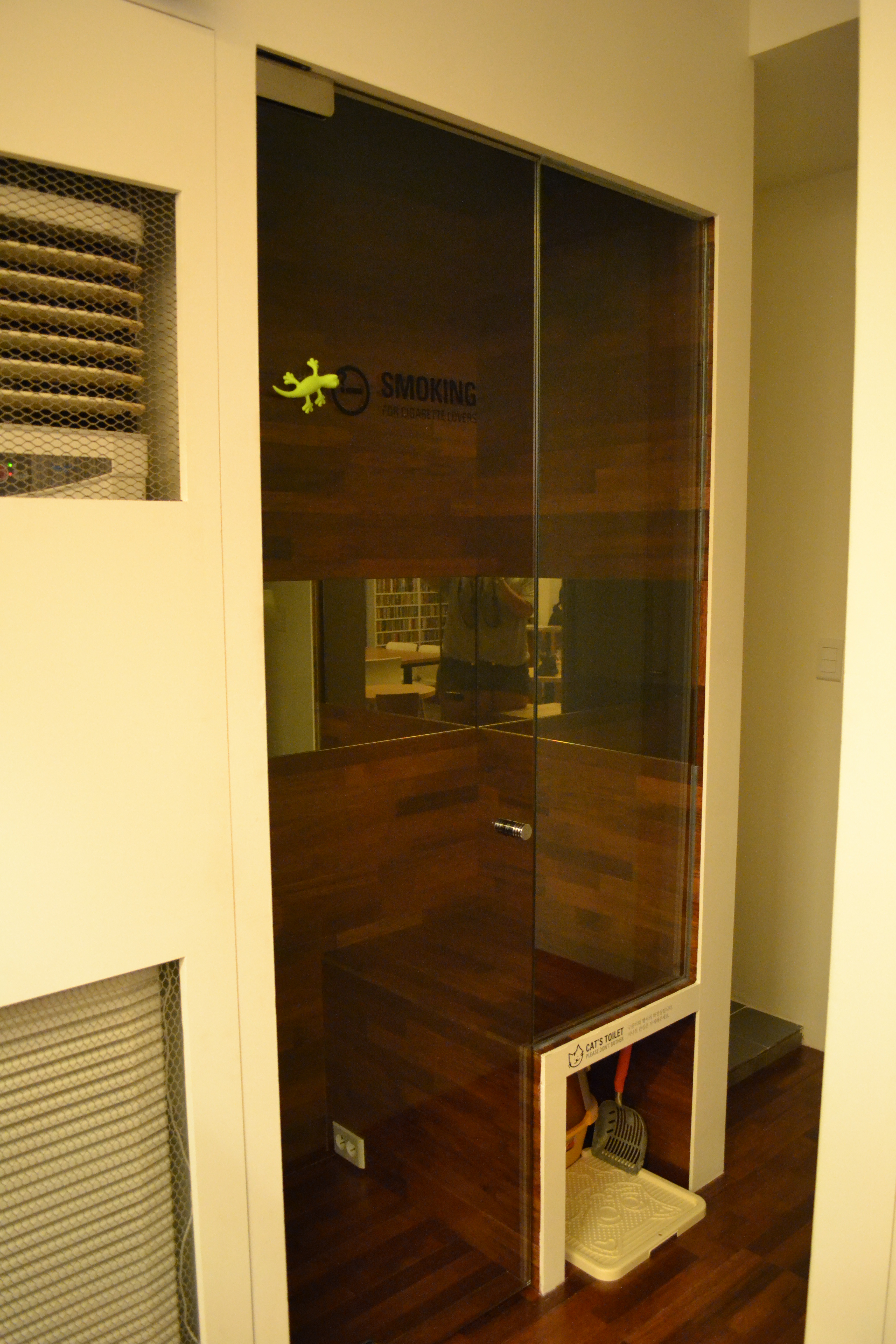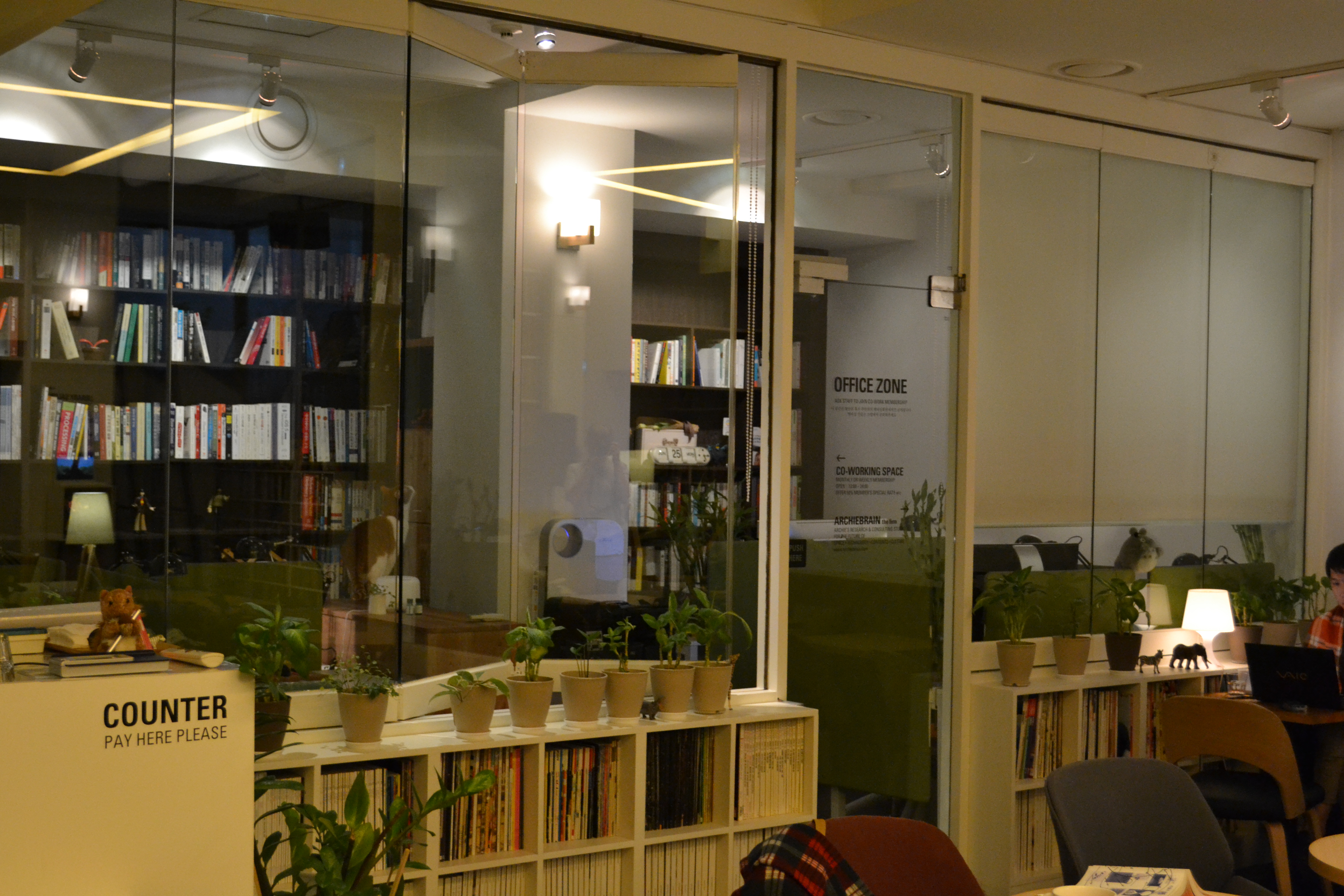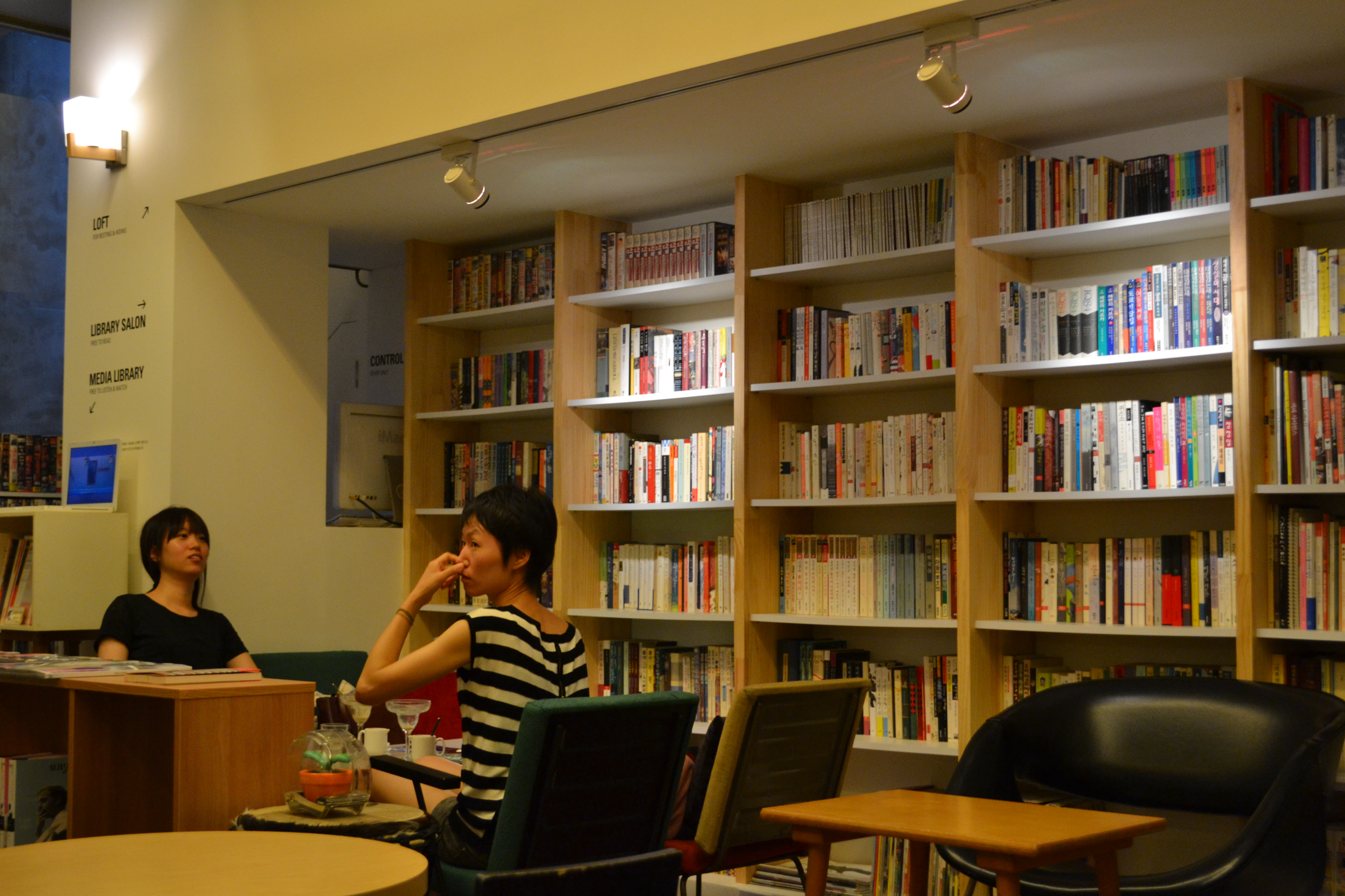 The cool café. It was for living in, sort of. A place to sleep, a smoking room, the café itself, tables and a work space. And you could choose the music that was playing 🙂 And it was very stylish.