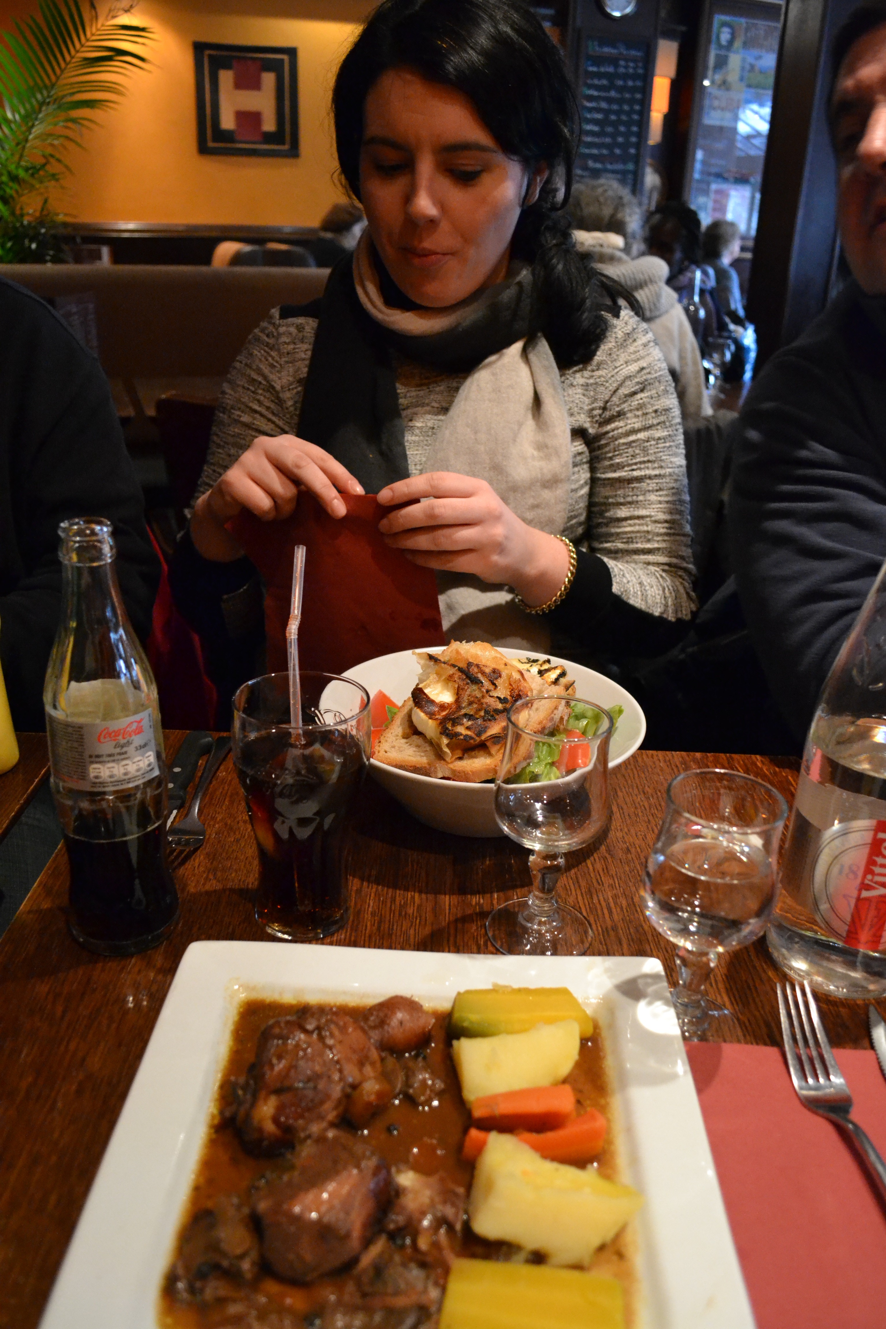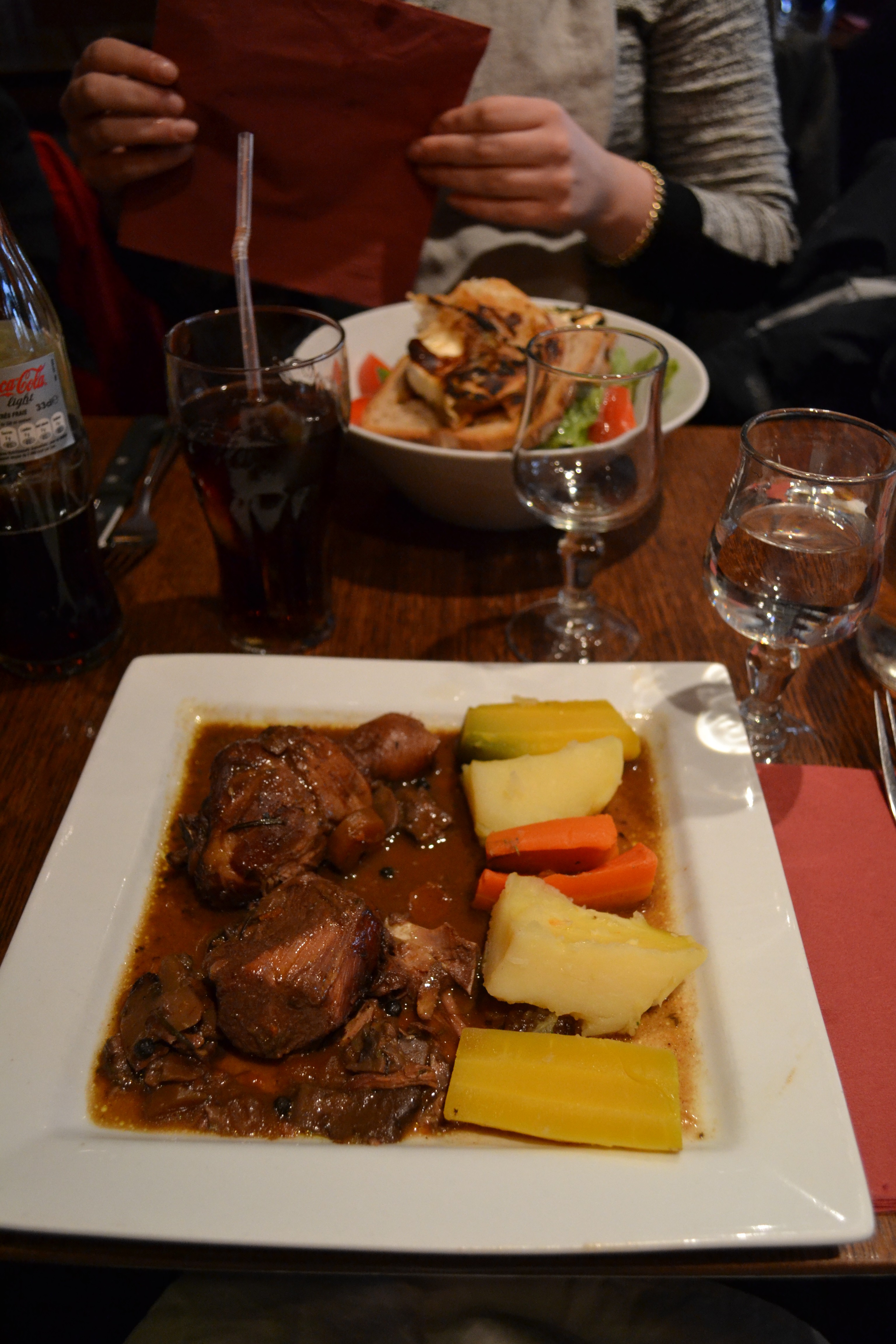 A normal lunch in France, coq á vin with veggies on a straight line. Very tasty!